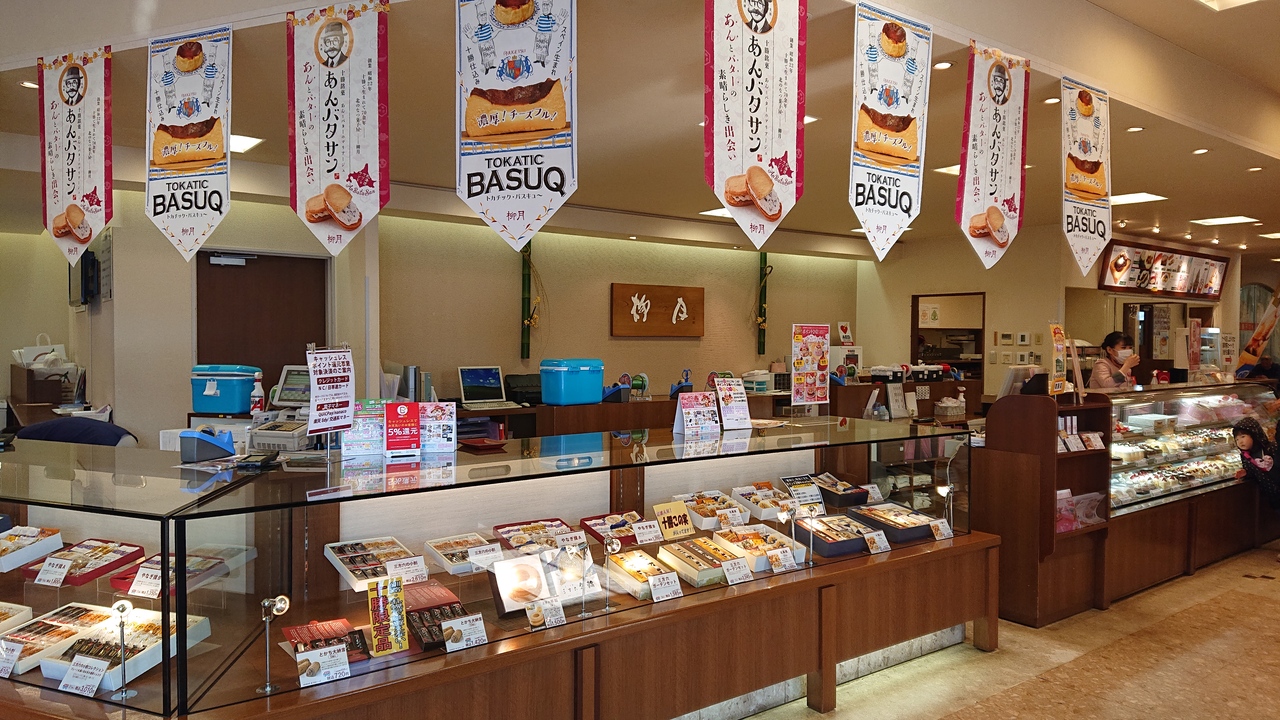 スイートピアガーデンから車で10分くらい、帯広駅から車で15分くらいのところにある、国道241号線沿いのピアザフクハラ音更店の中にある柳月。地元だけあって生ケーキも取り扱っています。場所柄、観光向けというよりは地元向けの印象。NHKのテレビ小説「なつそら」放送以来人気に火が着いた「あんバタサン」が、11時頃、スイートピアガーデンで売り切れだったので、こちらに向かいましたが、残念ながらこちらでも売り切れでした。