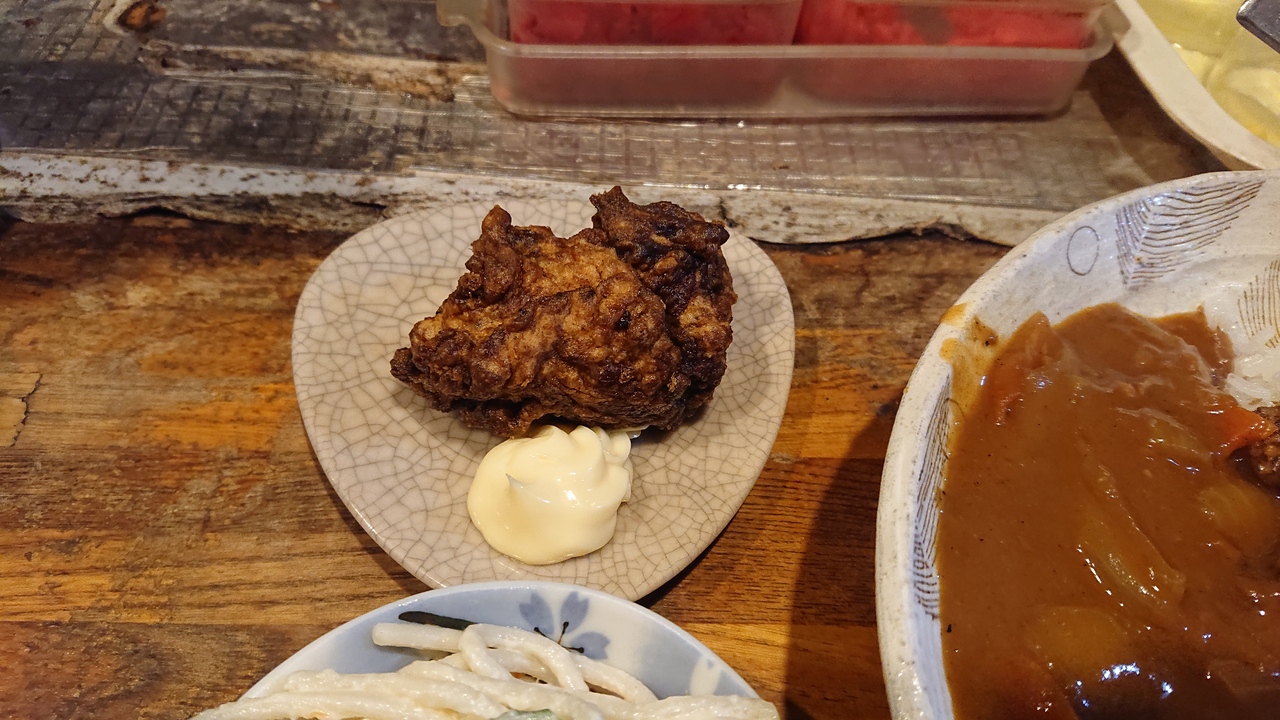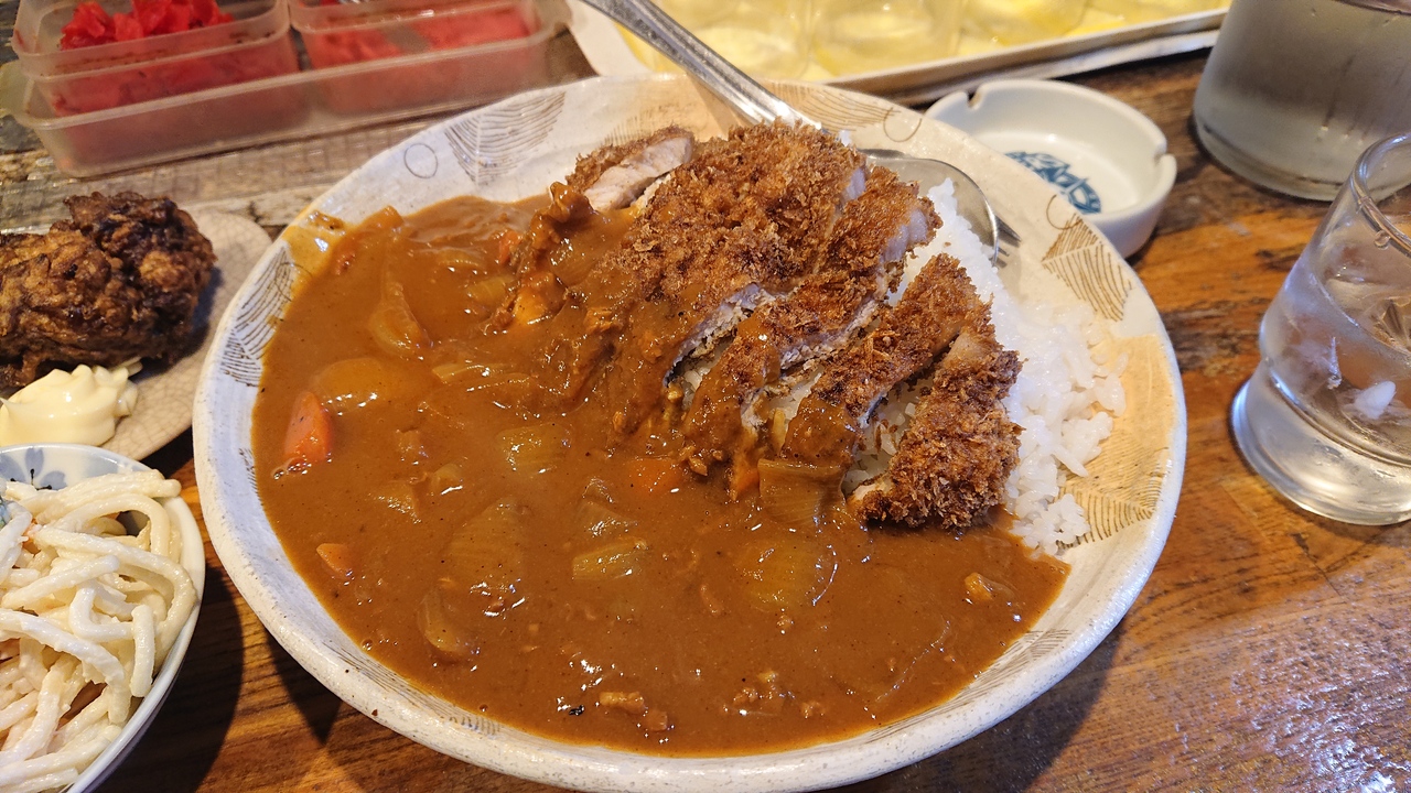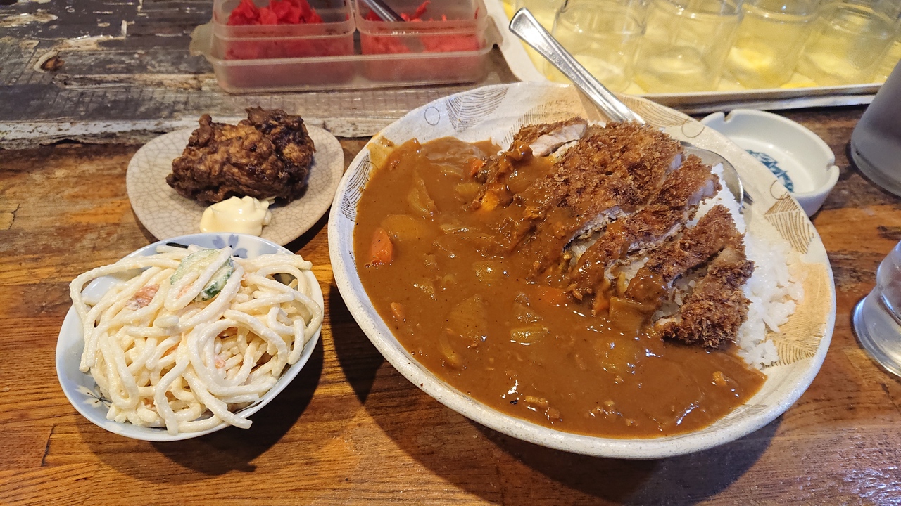 地下鉄東豊線豊平公園駅から徒歩5分くらいのところにあるお店。一見、入りにくい雰囲気だが、お客は多い。扉を開けると塀を隔てて二手に分かれるが、窓側よりもカウンター席のある方が人気のよう。かなり大盛のザンギ定食が有名ですが、カツカレーも人気。ザンギは一個150円から追加できるので、カツカレーとザンギ1個を注文。まずカツカレーが運ばれてきて、「これが普通盛り?」とボリュームに驚く。大盛のら、多分、食べきれない。注文後揚げられたカツは少し薄目のお肉に衣がサクサクしている。カツ単品でもいける。カレーは、最初は甘味を感じ、後からスパイスを感じるタイプで美味。カツにも合う。ザンギはサクサク揚がっていて、かつジューシー。今や珍しい分煙をしていないお店で、席に座るといきなり灰皿が置かれた。煙が苦手な方は辛いかも。