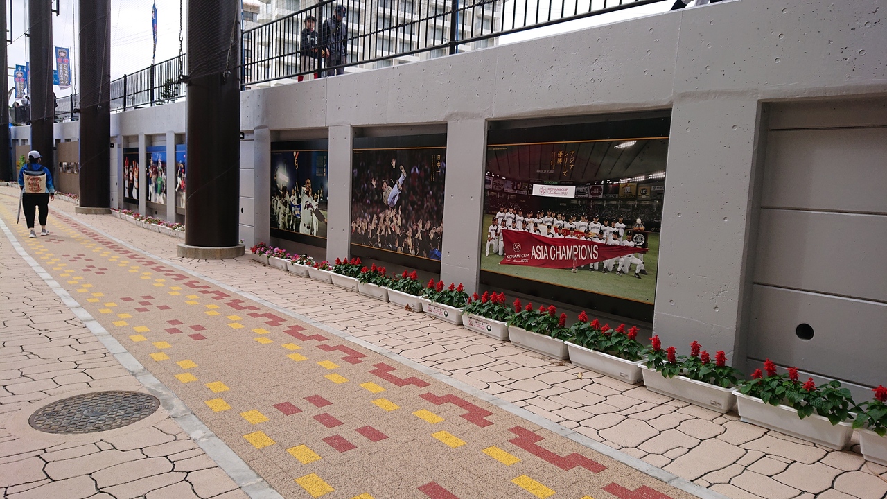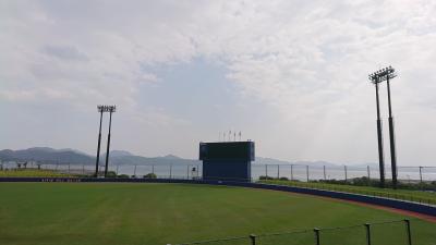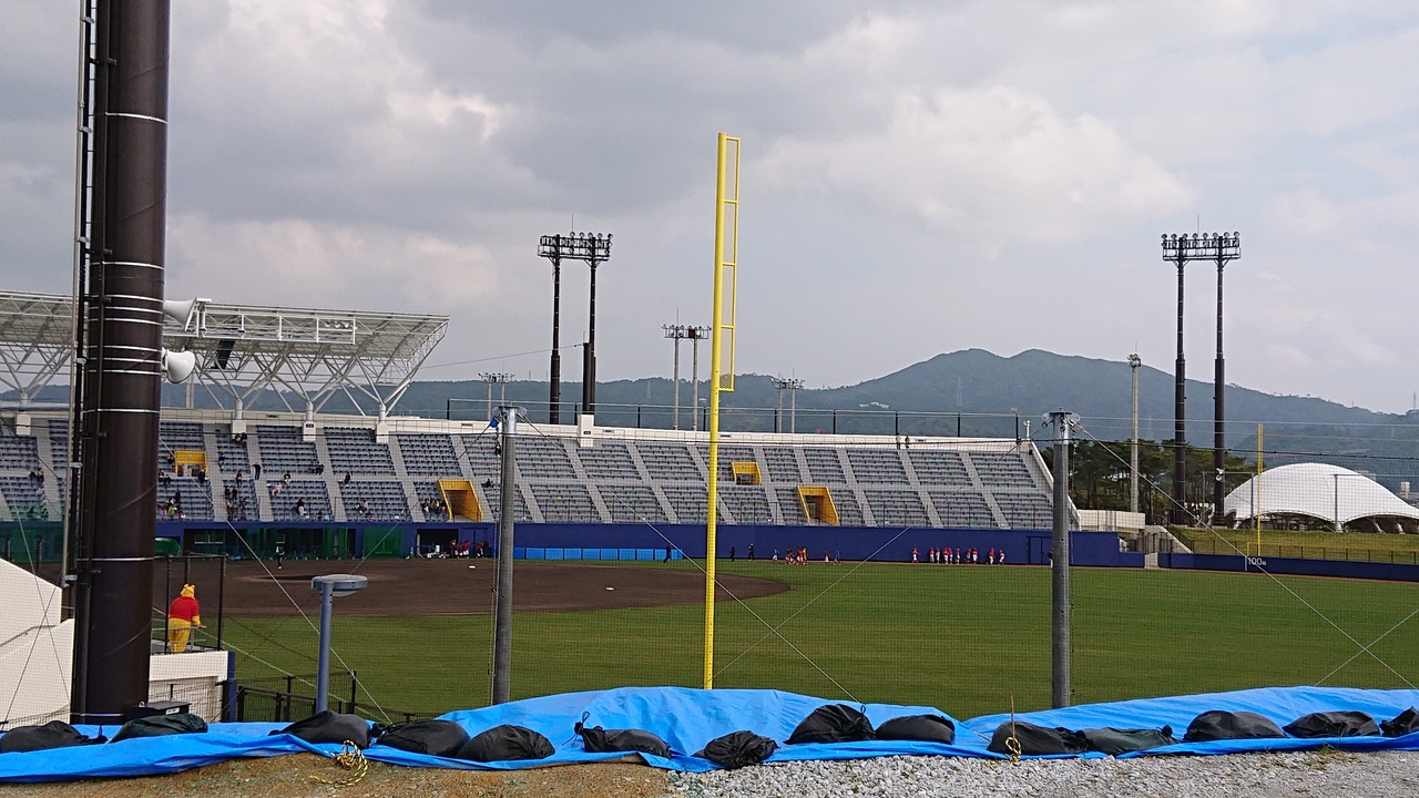 名護市役所から車で15分、21世紀の森公園内にある野球場で、2020年2月に全面リニューアル工事が完成。同時にネーミングライツが行われ、地元の医療法人「タピック」が契約、「タピックスタジアム名護」という愛称になりました。1977年開場、1979年から日本ハムファイターズが春季キャンプ地として使用。老朽化によって2016年からは後半のみの利用でしたが、リニューアルに伴い2020年シーズンからは全日程をこちらで行うことになりました。日本ハムの足跡もモニュメントのように飾ってあります。新しいだけあって全てがキレイ。特にトイレはかなりキレイで気持ちかよい。リニューアルによって内野スタンドの屋根の広さが拡張され、さらに快適に。両翼100m、中堅122m、収容人数約7300人、内野席からは名護湾か一望でき、オープン戦も行われます。