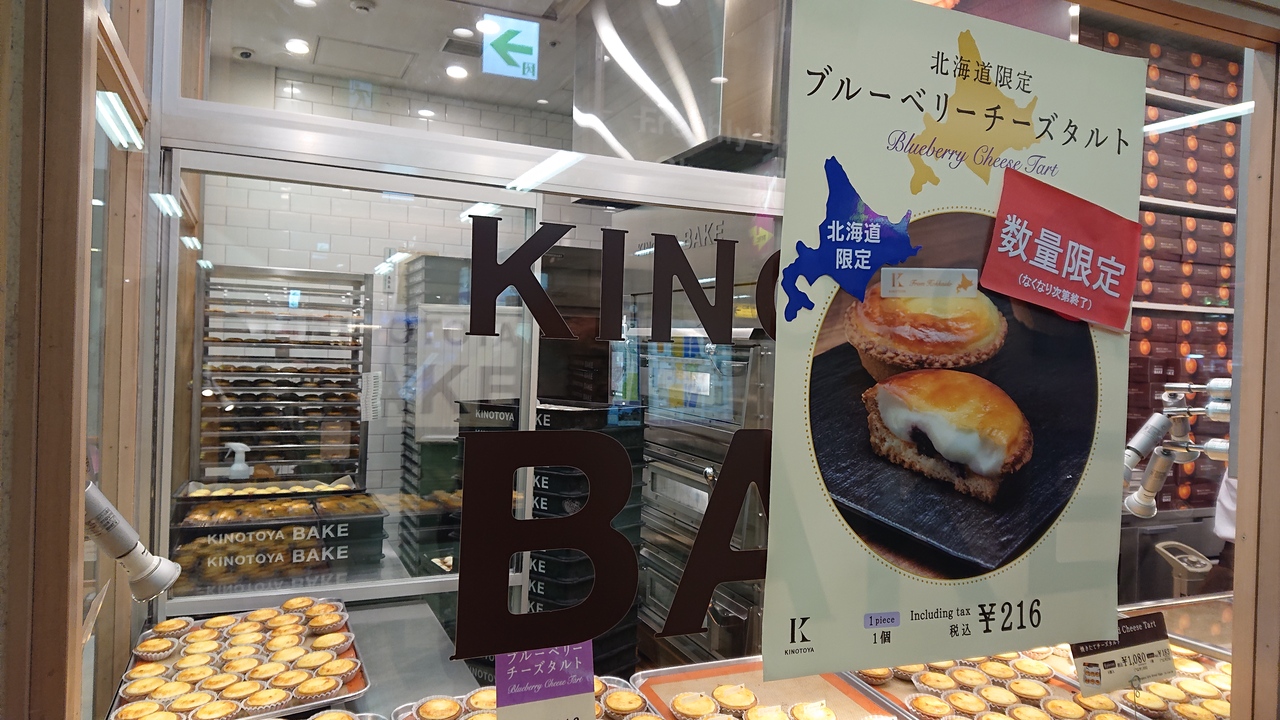 JR札幌駅東コンコースにあるお店。都内はもとより最近はタイ・バンコクにも進出したBAKEは、札幌に本店を持つきのとやの息子さんが始めたお店。北海道キオスクがきのとやとコラボして開店したのが、KINOTOYA BAKEで、作り方や味はBAKEの焼きたてチーズタルトと同じ。お店のなかの厨房で作られているので、もちろん出来立てを味わうことができ、お土産にも、電車の中で食べるに最適。北海道産のクリームチーズと生クリームで作られた焼きたてチーズタルトも美味ですが、北海道限定のブルーベリーは酸味と甘さのコラボで更に美味。