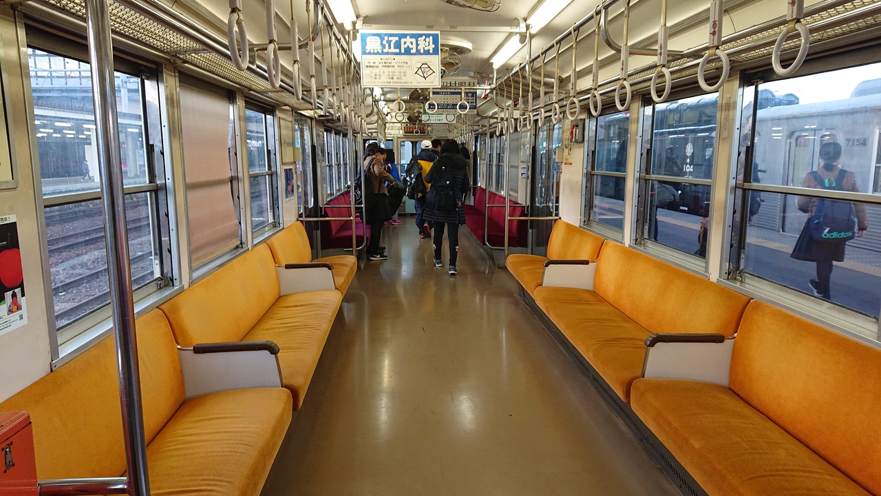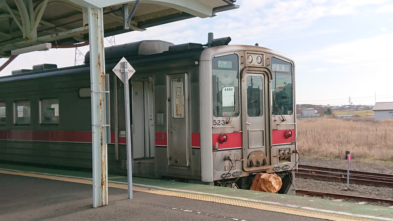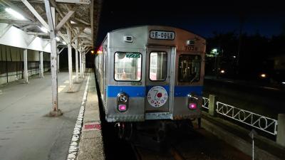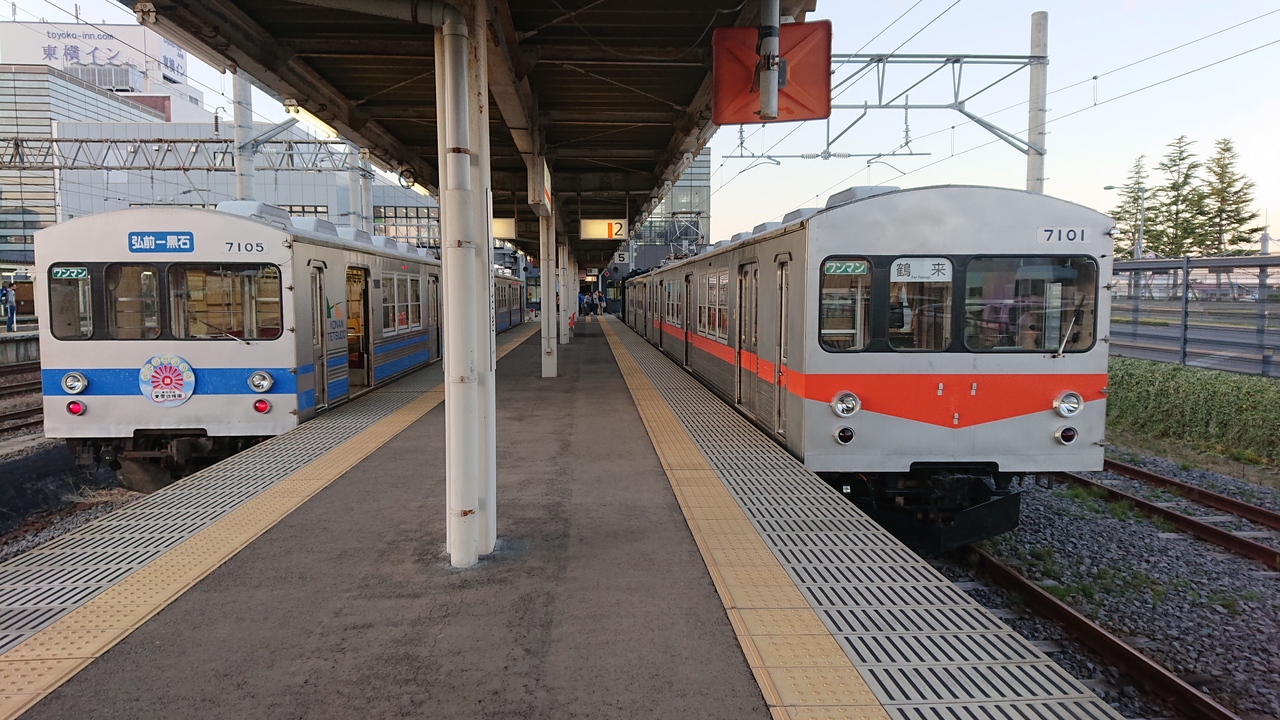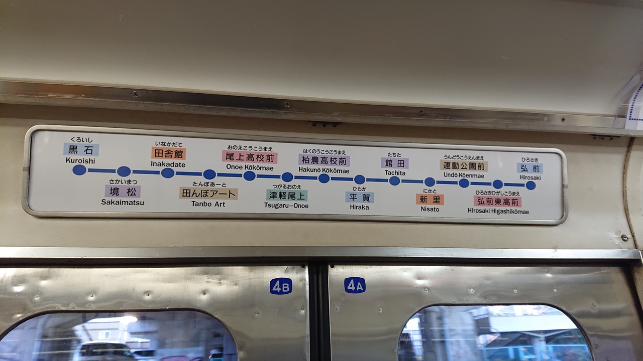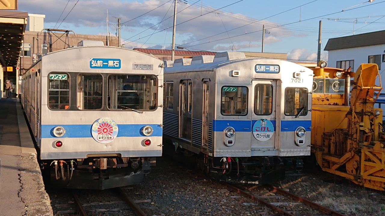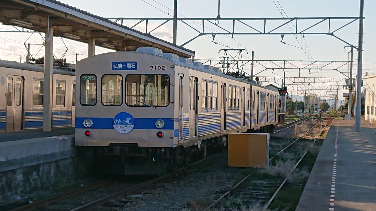 弘前から黒石までの16.8キロを結ぶローカル線。1927年9月、弘前~津軽尾上間11.1キロが開通。1950年7月、津軽尾上~黒石間が開通し、全通した。また、1948年7月に電化され、青森県で初めて電車が走った。2019年10月のダイヤ改正から弘前発6時8分の始発から8時38分までは30分ごと。しかし、そのあと9時50分から1時間おきとなり、16時35分から35分おきで21時40分が終電という大鰐線よりはよいものの不便なダイヤになった。とはいえ、沿線には高校が多く、高校生をはじめ地元では欠かせない足となっている。車両は大鰐線と同じく、1962年から生産が開始された元東急7000系が未だ現役で、車歴は50年以上。大きな改造がされていないので、寒冷地とはいえ冷房はなく、つり革には渋谷109の広告が残っている。東急7000系が地方鉄道に多数譲渡された関係で、水間鉄道、北陸鉄道、秩父鉄道、福島交通それぞれの車体カラーになった車両が走っており楽しい。