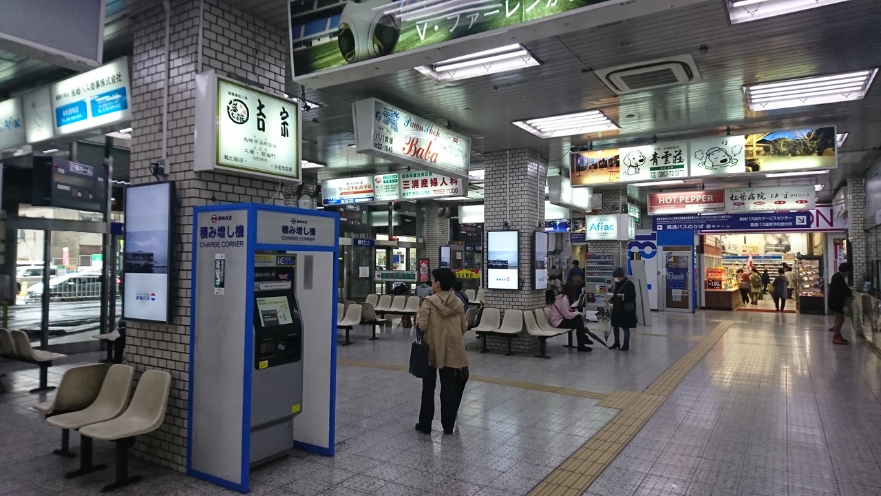長崎バスのターミナル。建物のなかには5つのホームがあり、主に北部方面行きのバスがこちらのホームから出発します。その他のバスはターミナルの外にある停留所から発着しており、長崎空港行きのリムジンバスも外に停留所から出発。待合室は隣の長崎バスターミナルホテル内にあるので注意。核テナントのイオン長崎店(旧ダイエー)やキャンドゥなどが入っていますが、どことなく昭和の雰囲気があります。ただ、出発案内はLED使用しており、案内放送も自動など最新式のものを用いています。新地の中華街や面影橋、出島、浜町マーケットなども徒歩圏内。新地中華街電停からもすぐのところにあります。
