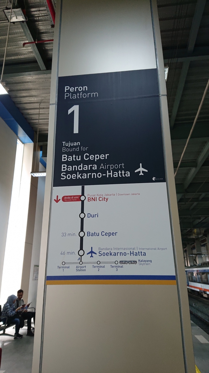 2017年12月26日に開業したスカルノハッタ国際空港とジャカルタ市内を結ぶ空港鉄道。従来、スカルノハッタ空港から市内へのアクセスはタクシーかバスしかなく、ジャカルタ名物の渋滞により時間をかなり要していました。空港鉄道を利用して場合、スカルノハッタ空港駅からMRTのスディルマンバル駅と接続するBNIシティ駅まで46分なので、時間が読めるようになったと言えばそうなのですが、かなり落とし穴があります。まず、空港駅から隣のバドゥチエペル駅間のみが専用線でその他はインドネシア国鉄の線路を使っているので速度がかなり押さえられており、また結構遅延もします。次に空港ターミナルに直接乗り入れておらず、スカイトレインに乗らなくてはならないものの、13分間隔と本数が少ない。さらにスカイトレインとターミナルの移動が十分に整備されておらず、かつ分かりにくい。一番問題なことは、駅の周辺が整備されているわけでもないので、MRTを利用できない場合はタクシーを利用しなくてはならないのですが、なかなかつかまえにくく、結局、タクシーで直接ホテルに向かった方が楽で、余計な時間もかからない。こうしたことから徐々に乗客数が増えてはいるものの、ガラガラの状態です。今回、空港に向かう際に使いましたが、ホテルからBNIシティまでタクシーを使わざるを得なかったのでそこで30分程度はかかり、スカイトレインもあまり待つことはなかったものの30分程度はかかっているので、これではメリットが見つけにくい印象。もう少し周辺成美が進まないと当分は利用するか微妙です。