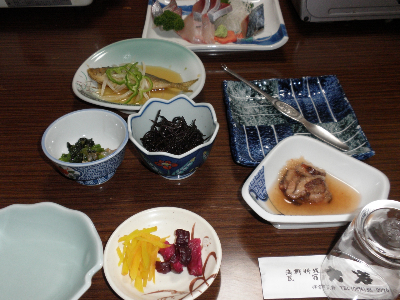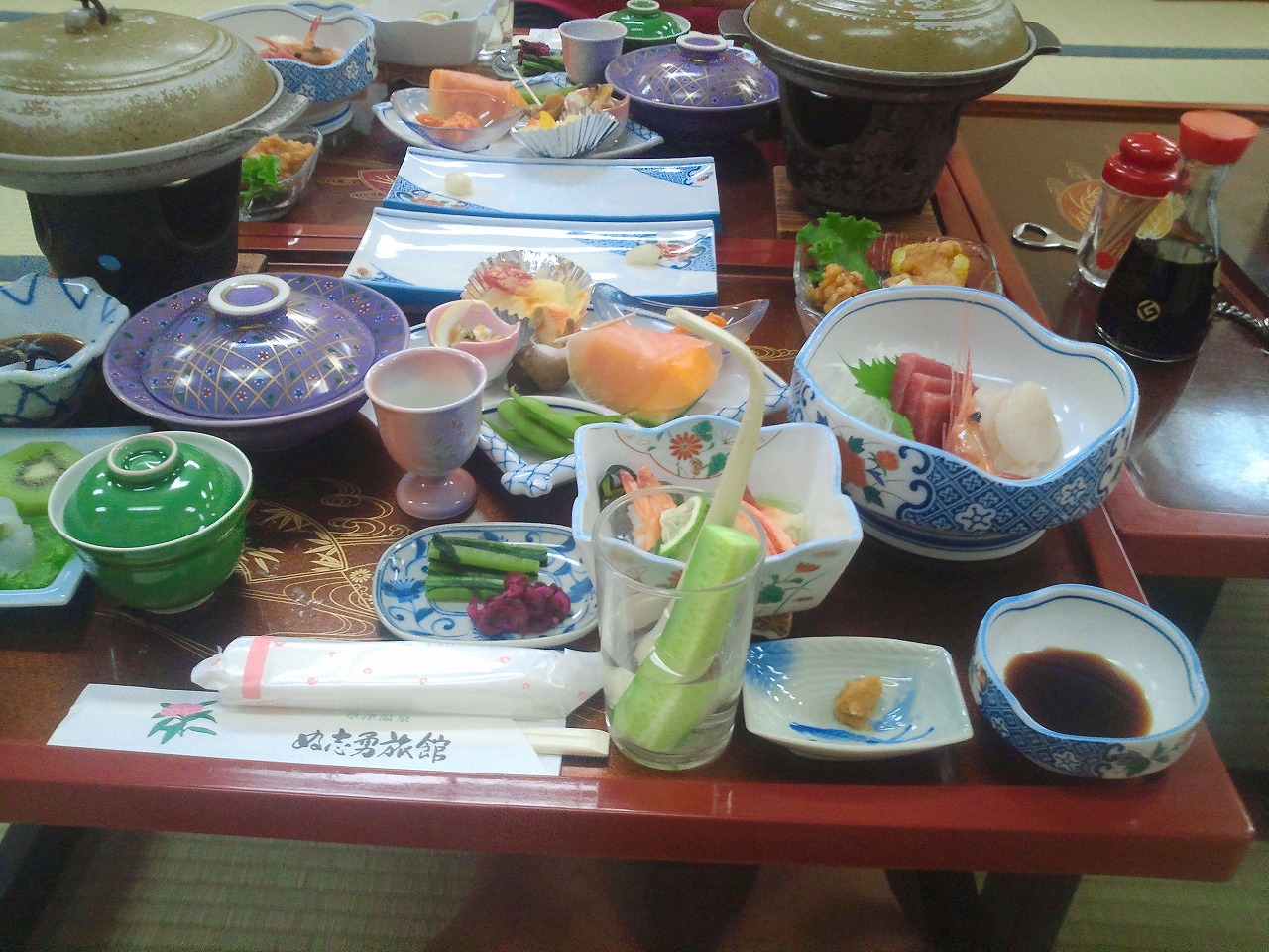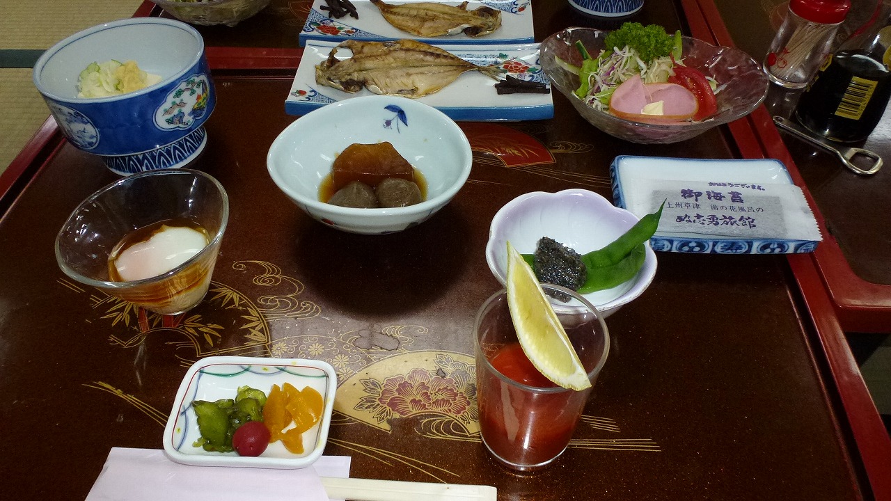 草津温泉湯畑のすぐそば。便利のいいところにあります。一番人の多いところにある宿なので,車で乗り入れるのには少し抵抗があります。でも車はすぐどこかに持って行かれます。すごい階段の多い宿。私の部屋は一番上でした。すぐ風呂に入る。熱ーーーい!!!部屋に戻るとこれまたエアコンなしで暑−−−い。(8月です)。18:30より夕食。広間で食べます。夕食はなかなかいいよ。腹一杯。広間はエアコンが効いてました。外出から帰って露天風呂に。夜には涼しくなって,お部屋はエアコンなしでも大丈夫。朝食も適量。おいしく頂きました。ただ,朝食の時は広間のエアコンは切ってあり,少し暑かった。お盆で料金はかなり高め。