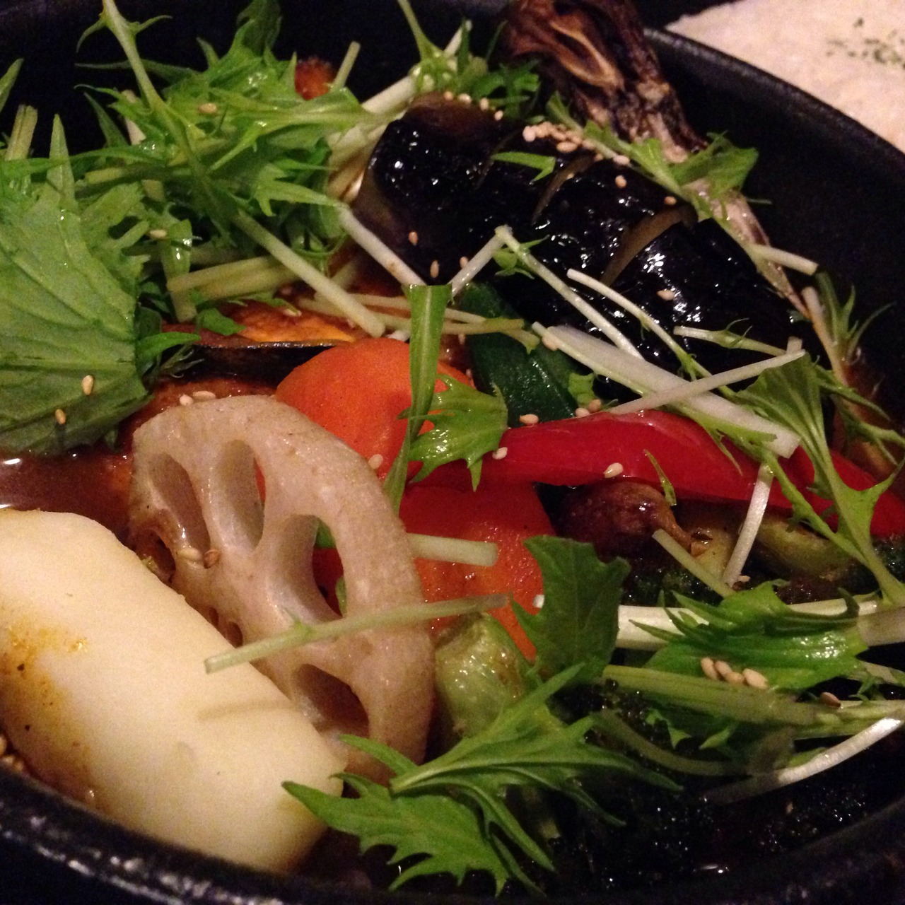 チキンとベジタブルのカレーにアイスティー(ランチサービスで70円)を付けて1250円とお手頃な価格でした。最初はあっさりとした味と思いましたが、スープをかき混ぜたら丁度良い辛さになり、店名の通り、ヒリヒリしました。- 旅行時期