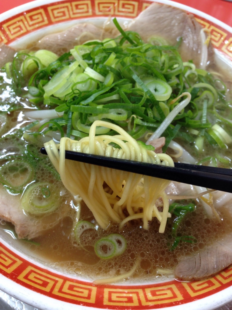 私は中華そばを注文しました。油の量が多く、麺は細めん、豚骨醤油味のスープ。テーブルには、にんにくおろし、揚げにんにく、ニラの唐辛子あえ等のトッピングがありました。