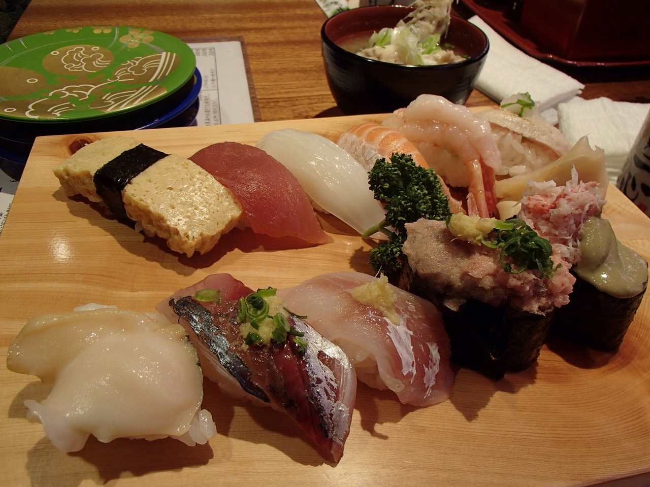 15時くらいに訪問しましたが、この時間は回転している寿司はなく、板さんに食べたいものを注文しました。セット盛りがいろいろとあり、種類が食べれます。美味しいと思ったのが、イカと鮭のあら汁でした。お値段もお手頃なので休憩がてら、入るのもいいかもしれません。- 旅行時期