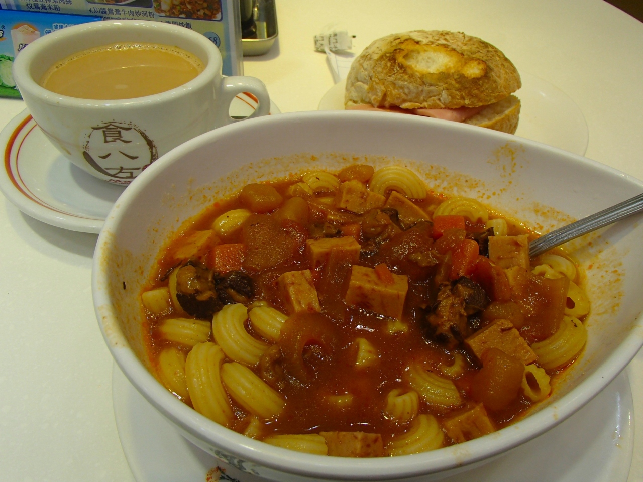 マカロニ入りのトマトスープ、カリカリのトースト、甘ったるいコーヒーと