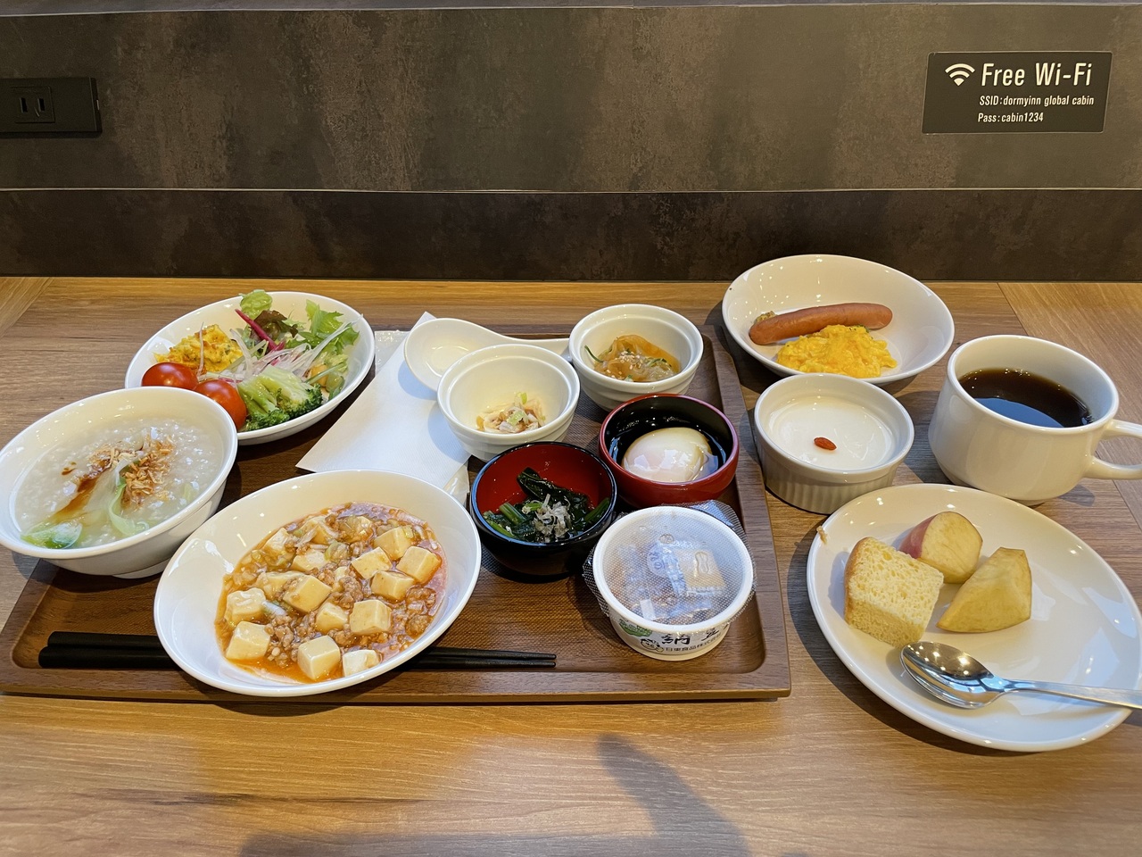 私が予約したときは、5300円で朝食付きでした。カプセルホテルですが、ドーミーインのサービスは踏襲されており、夜鳴きそば、湯上りアイス、朝のヤクルトと嬉しい限りです。お風呂は男女入れ替え制で二人くらいしか入れそうもないこじんまりとしたものですが、他にサウナ、シャワールームがあるので問題ないと思います。フロントの方から説明が無かったのですが、貸切風呂もあります。家族で泊まれる4人部屋があるみたいなので家族風呂という位置づけなのかもしれません。朝食は1300円で通常のドーミーインの半額くらいですが、その分料理の品数も少ないです。フカヒレごはんや中華がゆ、麻婆豆腐、杏仁豆腐が食べれますので、コスパは良いと思います。