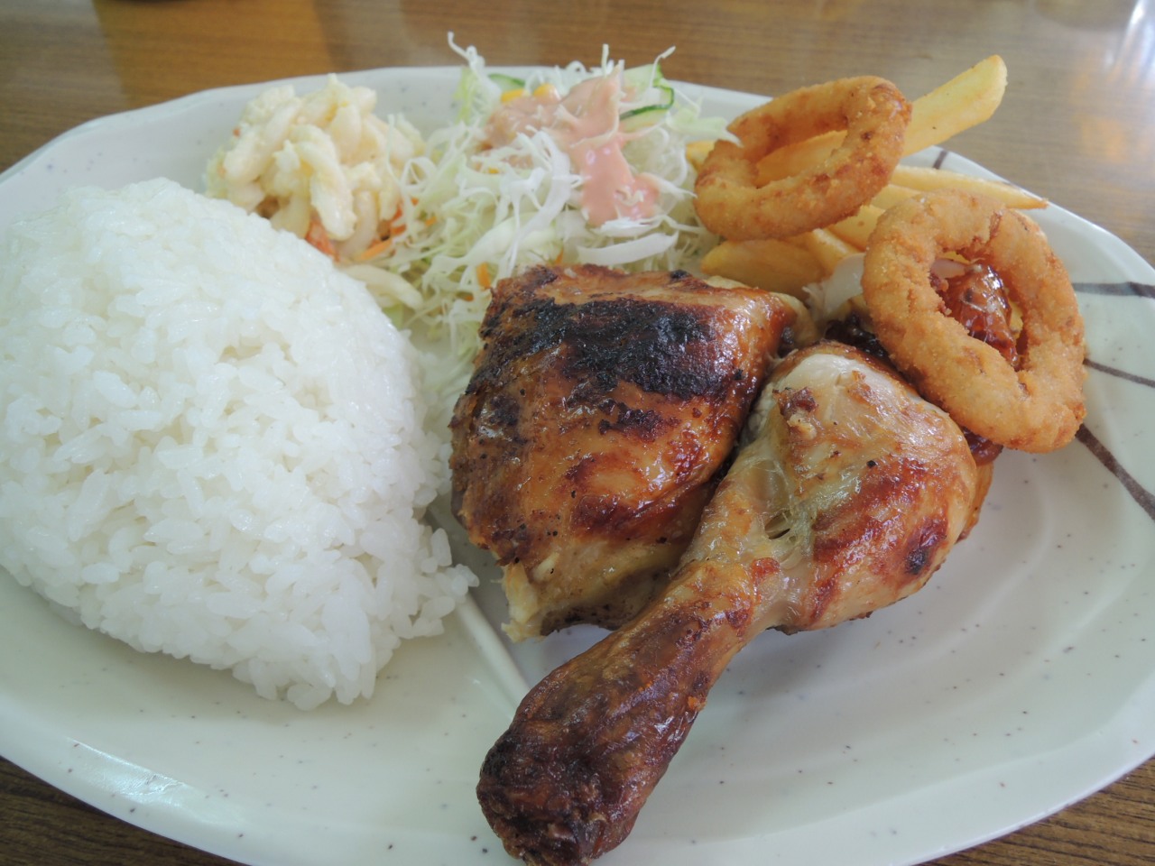 にんにくの効いたバーベキューチキンにポテト、キャベツ、スープがついてきます。