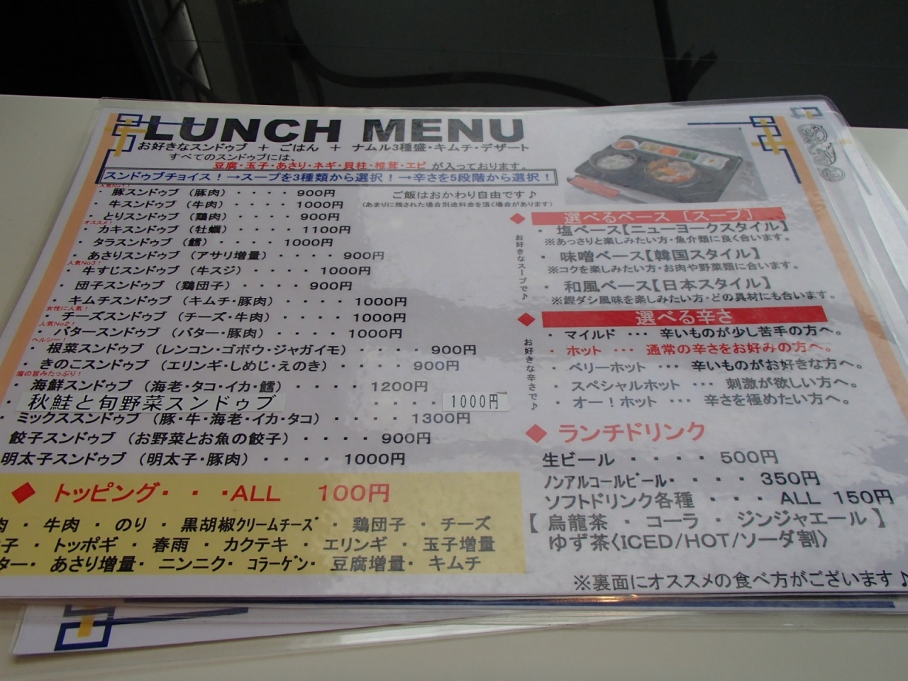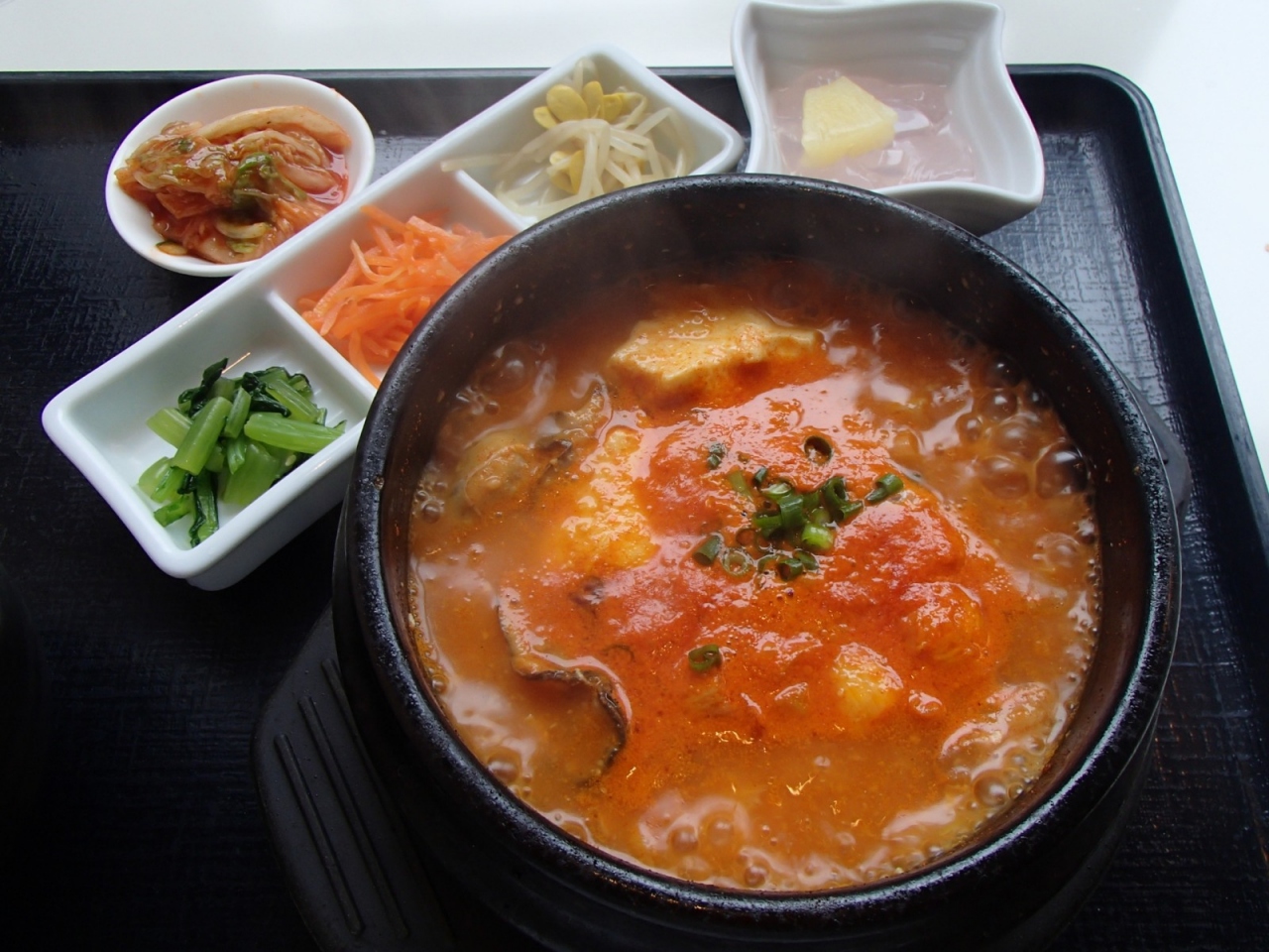 パルコの裏側の並木通りにビル2Fにあります。お昼はスンドゥブのランチセットが900円からあります。メインのスンドゥブにご飯、ナムル3種類、キムチ、デザートがつきます。