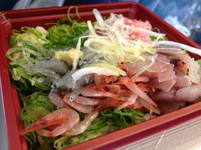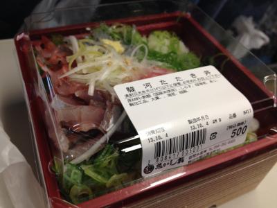 静岡駅でお弁当を買う時は、駅弁を買うのもいいけど、駅ビル1Fにある食料品館もお勧めです。今回は沼津魚河岸寿司でワンコインの海鮮丼を購入。鯵、しらす、桜海老とコスパが良かったです。いつもある訳では無いのでご注意ください。