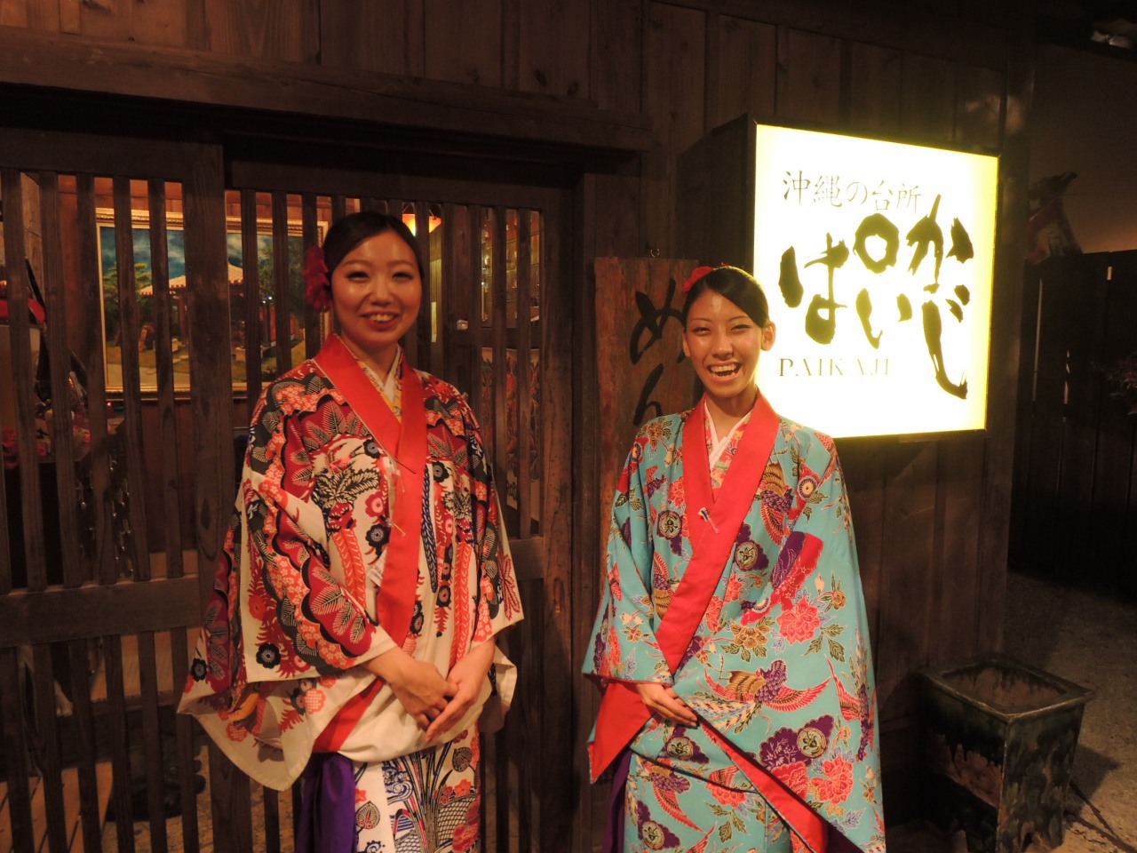 琉球衣装をまとった女の子が記念写真に回ってきたり、三線の生演奏を客席ごとに