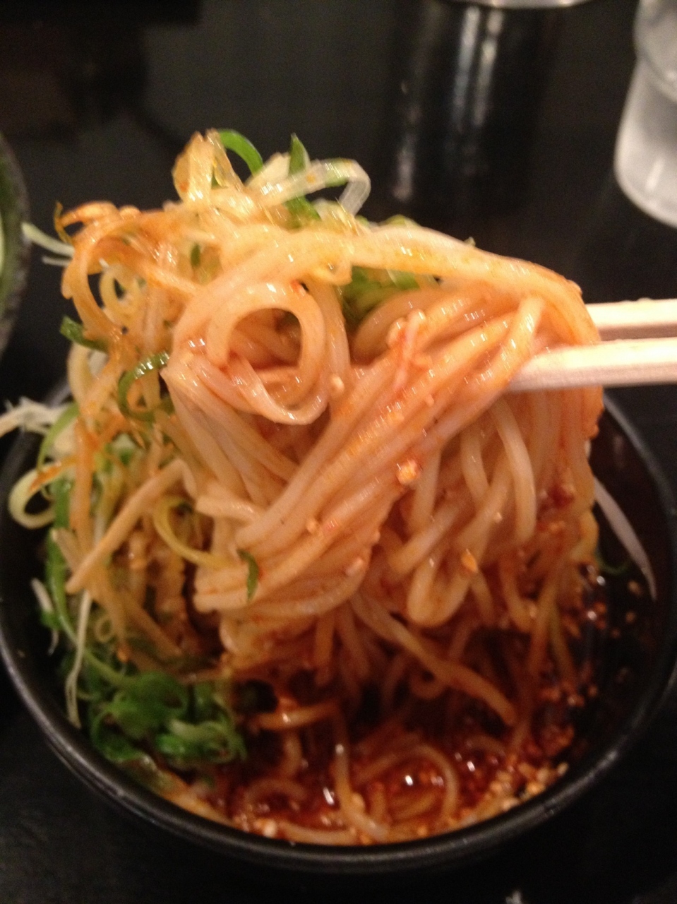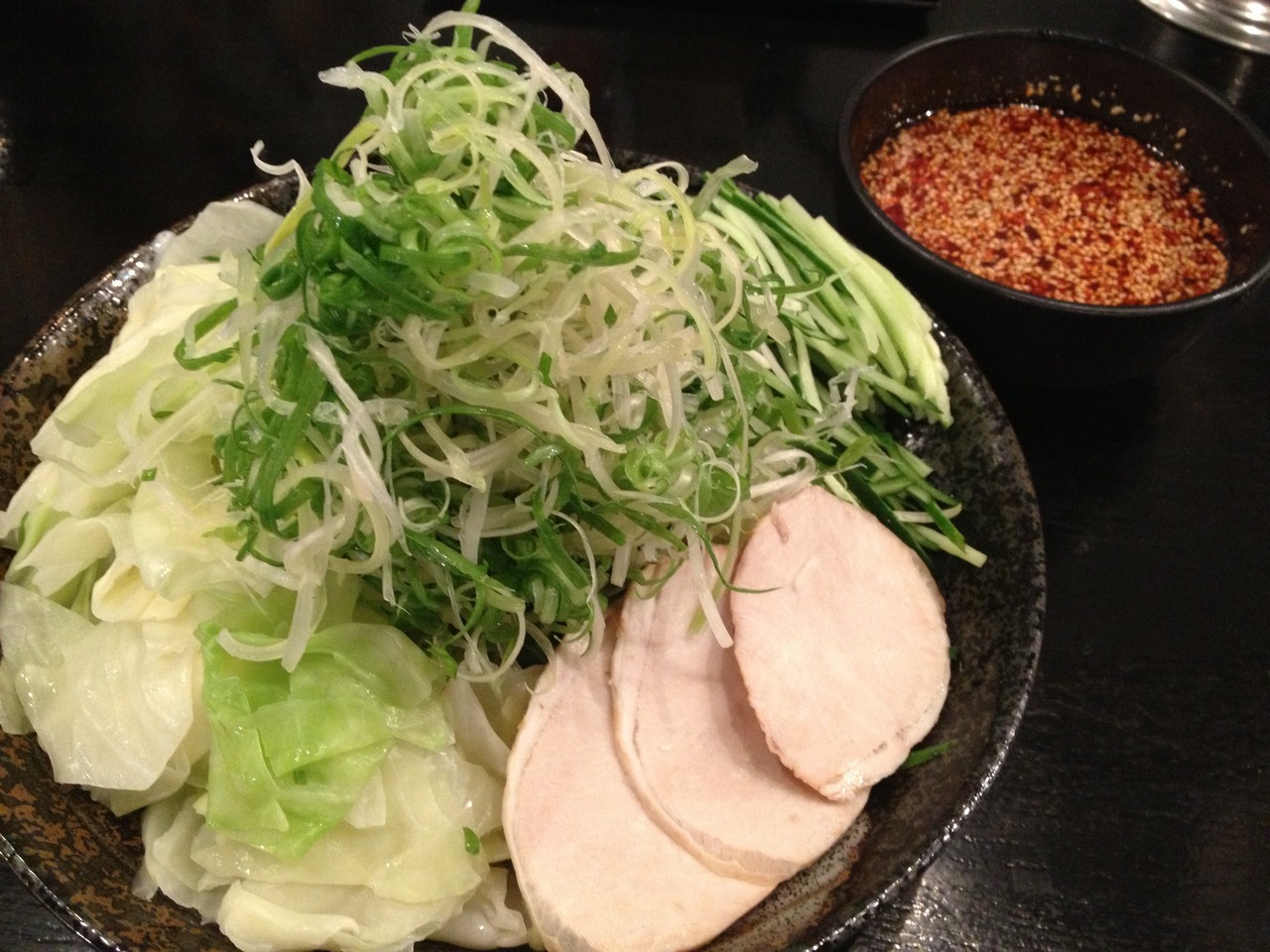 広島のつけ麺屋「ばくだん屋」では広島風の辛いつけ麺が食べれます。いつもは麺を大盛りにしますが、今回は野菜大盛りにしました。白髪ネギが多くて食べるのに苦労しました。麺と野菜のバランスが大切です。
