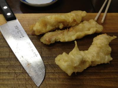 テーブルにはまな板と包丁が置かれ、これで固いホルモン天を刻みます。
