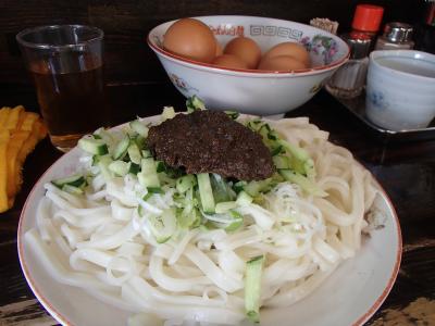 じゃじゃ麺の有名店でしたので訪問してみました。初めてのじゃじゃ麺、調味料の入れ方が判らなかったので地元の方の真似をしてラー油やニンニク、酢を入れてみました。すると醤油に使った何かを入れていたので聞いてみると唐辛子の醤油漬けとか。私も真似して入れてみましたが、同じ味だと飽きてしまうので、味にアクセントがついていい感じ。地元の方いわく、3度食べると病みつきになるそうです。最後に少し麺と具を残して玉子を入れて混ぜて、カウンターに出すとスープを入れてくれます。ちーたんというそうでこれも楽しい。味噌を溶かす量や塩で味を整える必要があります。結構マニアックな一品ですが、自分好みの味が見つかると病みつきになるのでしょうね。三度訪問するのはちょっと難しいそうですが。。。