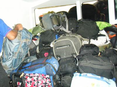 船の一番前の席に陣取りました。が…、目の前にバックパックの山が完成。決...
