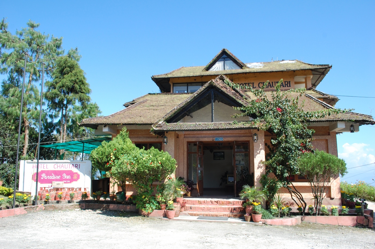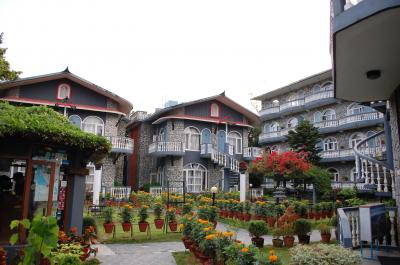 ヒマラヤが見える東の斜面に、コテージ方式でいくつかの建物が建っているホテル。
