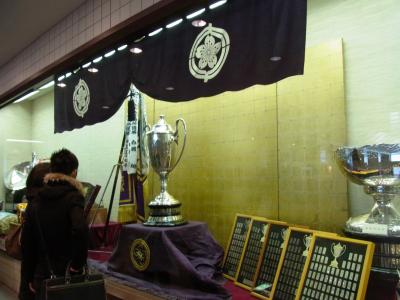まず、チケットもぎりを親方がやってくれます。内部に入ると、賜杯や盾の展示、お土産ものの売店や、相撲協会のゆるキャラとの記念撮影会などなど、楽しめるところがいっぱいです。地下では相撲部屋のちゃんこ鍋も食べられます。