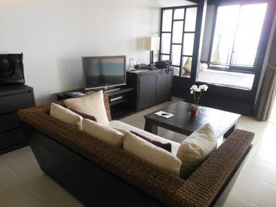 リビングエリアと寝室そして 海が見えるバスルーム。
