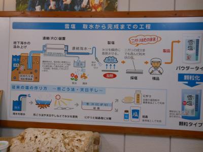 宮古島の雪塩について原料となる海水の特徴から製塩方法の流れ、お塩のいろんな使い方まで丁寧に説明してくれます。