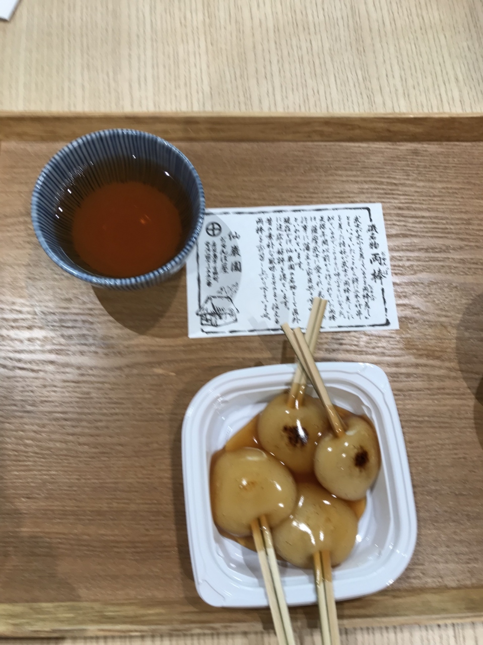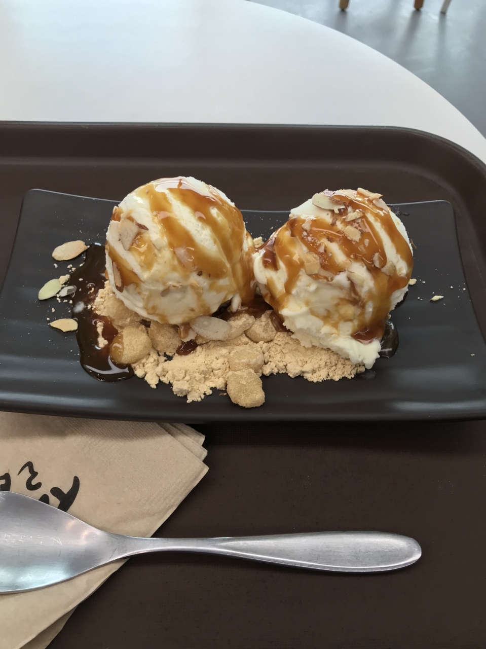 バニラのアイス二つの上にキャラメルソースとお餅がのっていて美味しかったです。