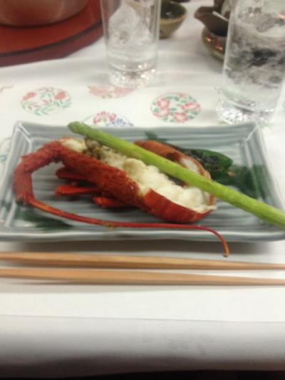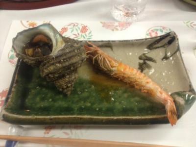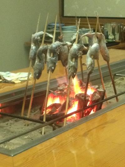 夕食は囲炉裏で魚・肉・野菜などの焼き物でした。