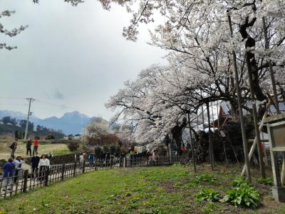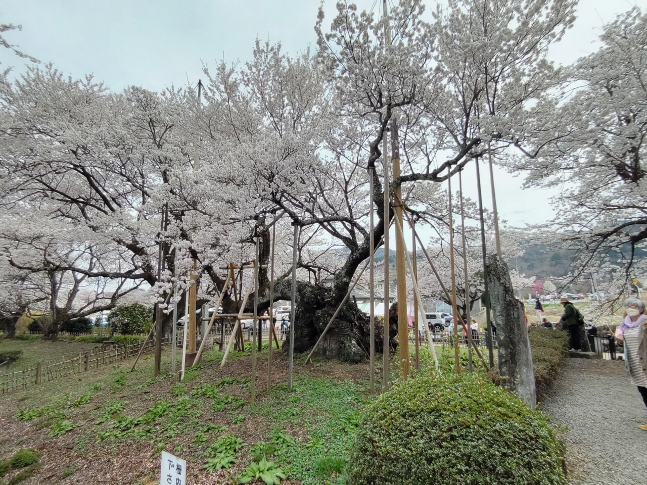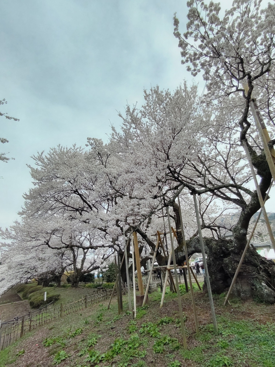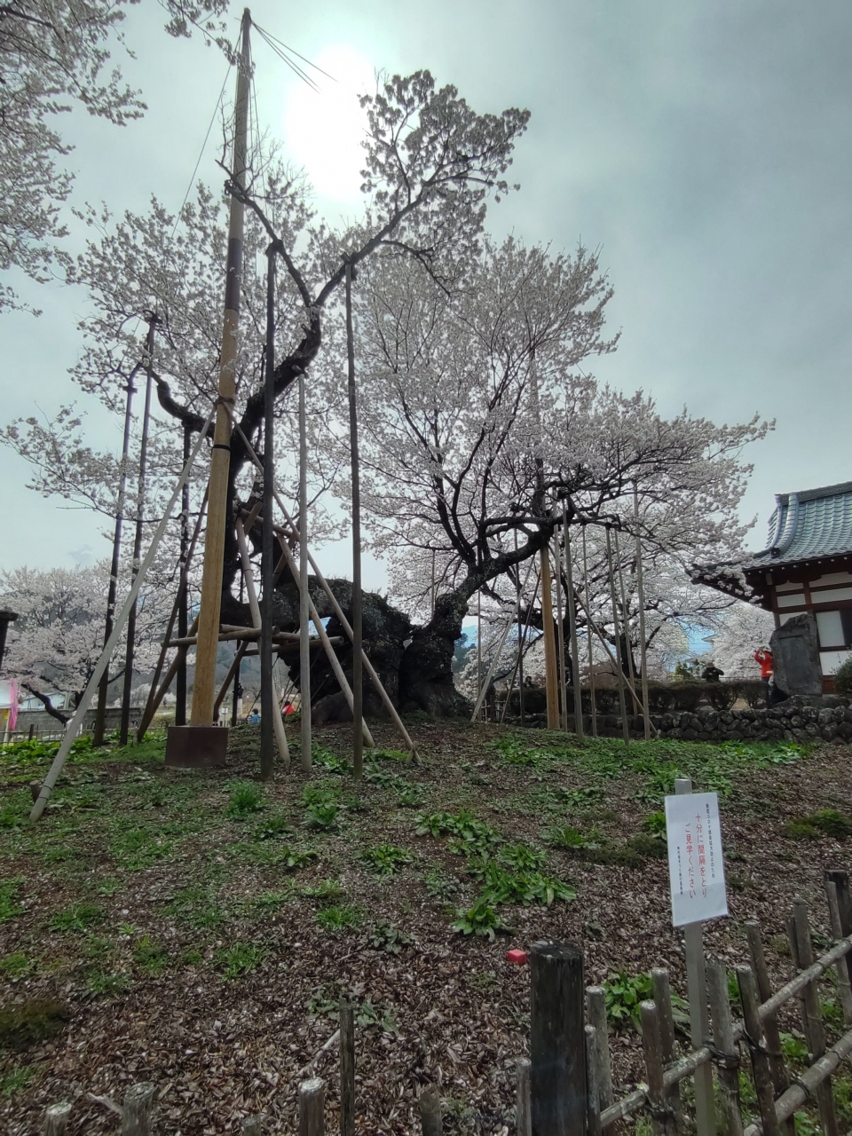 日本三大桜の一つで樹齢約2000年の古木,神代桜を見てきました。実相寺の境内に立つこの見事なエドヒガアンザクラは樹高は10.3m、根元・根回り11.8mあり、日本で最古・最大級です。お寺の門をくぐり神代桜二世や枝垂桜,水仙などの他の樹木が植わっている参道を進むと本堂の左奥に神代桜があります。老木で支柱に支えられながら見事に花を咲かせていました。