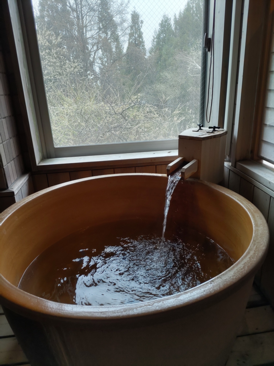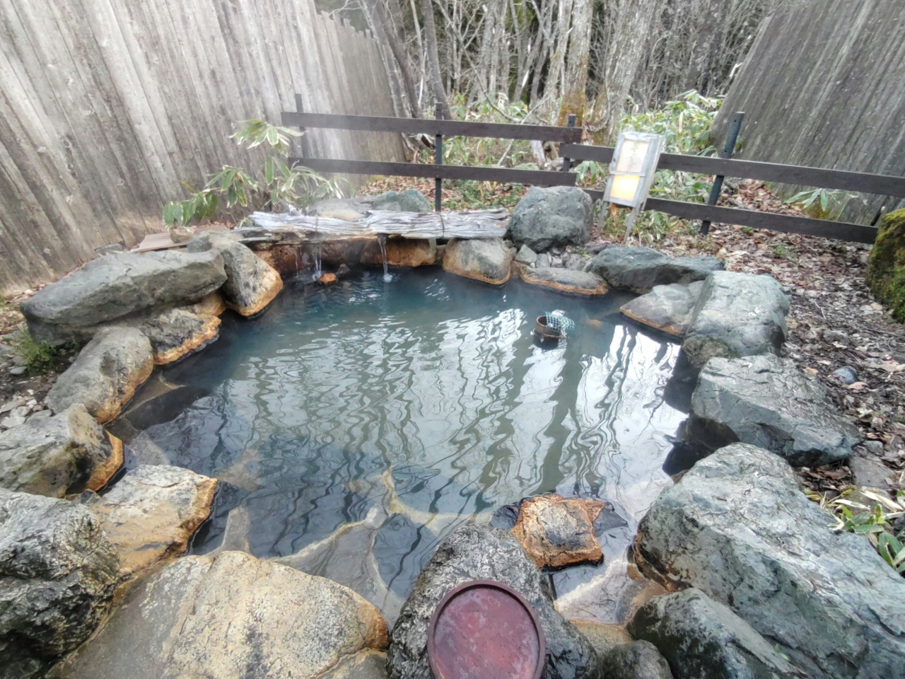 - 露天風呂は硫黄泉の濁り湯,内湯は高温,低温の透明な湯