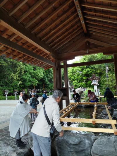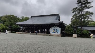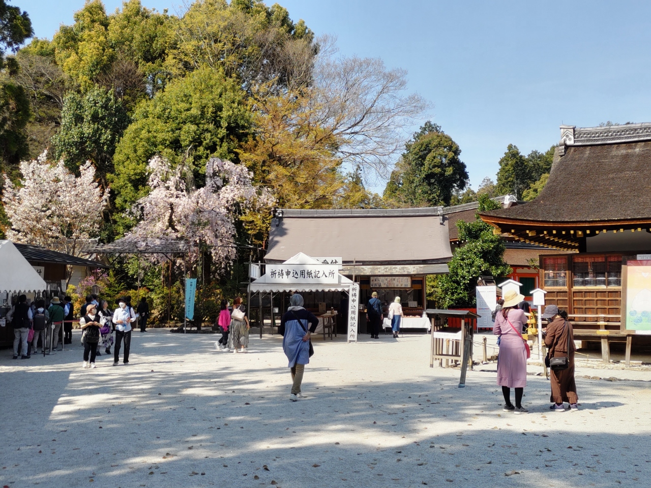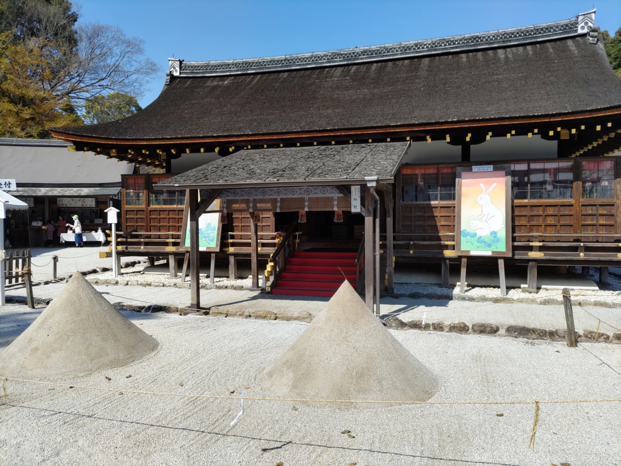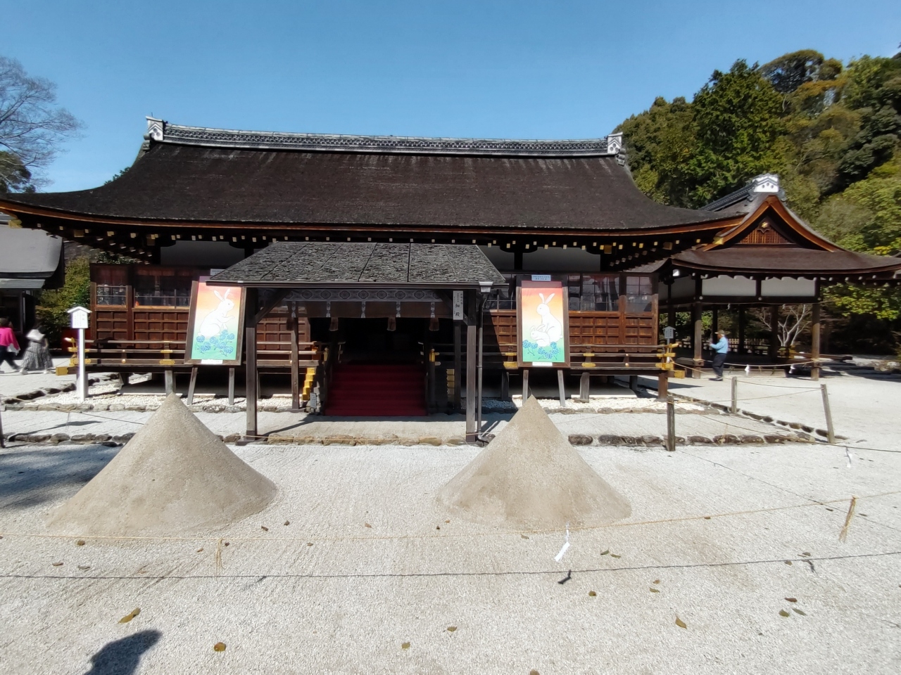 上賀茂神社に行ってきました。この神社の細殿の前に神山をかたどって砂が盛られた二つの立砂があります。この立砂は「魔を払う力がある」とパワースポットとして注目されています。私たちが訪れた時は快晴で、細殿の濃い茶色と背景の澄んだ青空そして立砂の白の3色のコントラストが素晴らしく、神々しさを感じる光景でした。