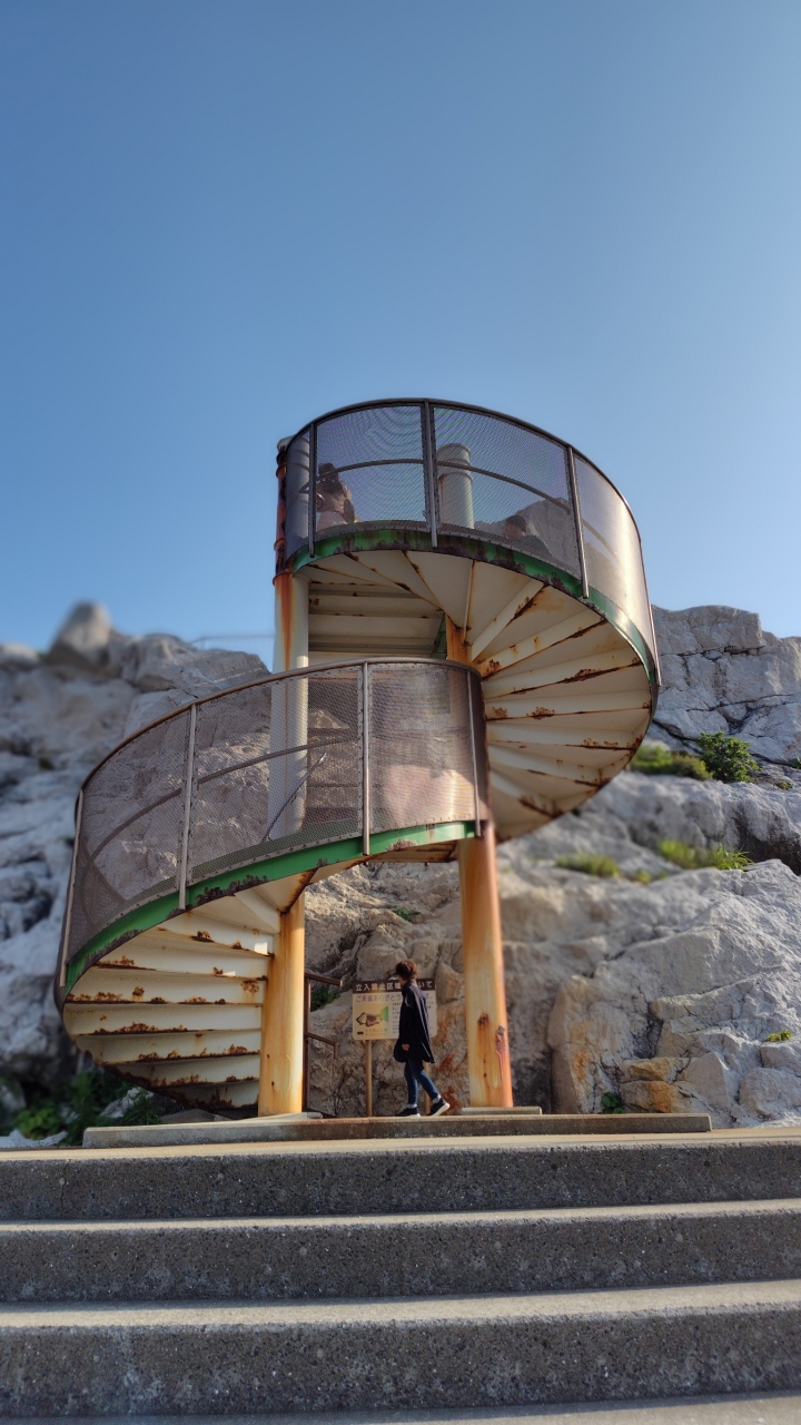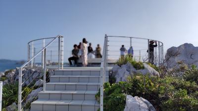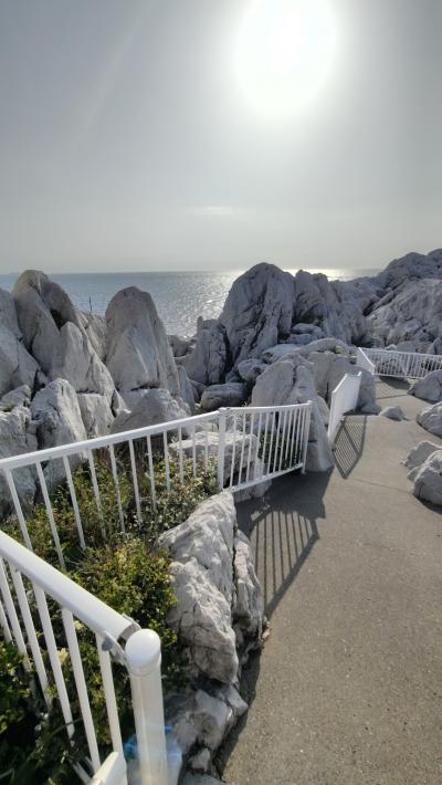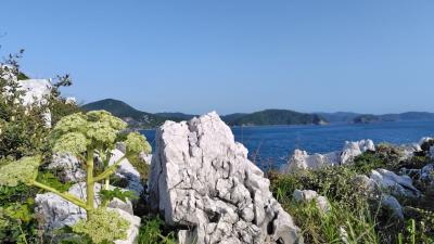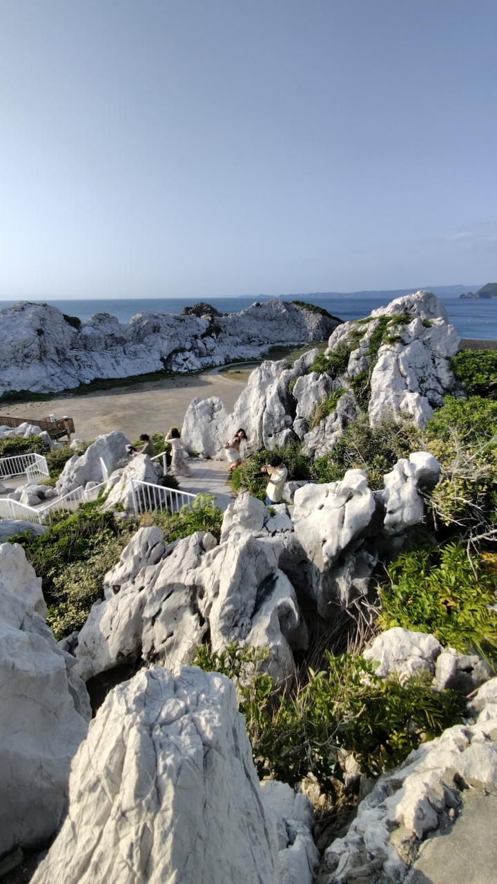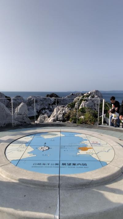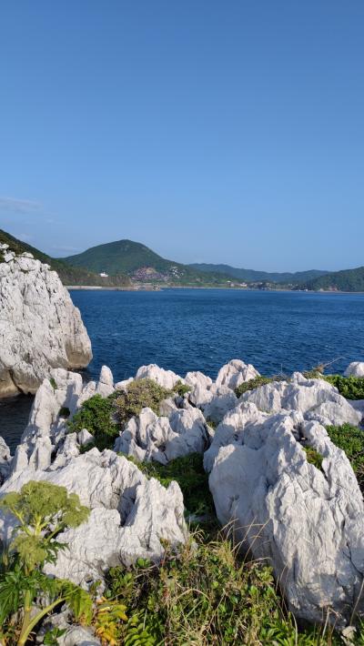 道の駅白崎海洋公園と併設された石灰岩の白崎海洋公園展望台は日本夕日百選にも選ばれた絶景で公園全体が白い石灰岩で囲まれ、青い海と氷山のような白い岩のコントラストが美しく、周囲は豊かな自然に恵まれています。この石灰岩は、2億5千万年前の古生代ペルム紀のものだそうです。