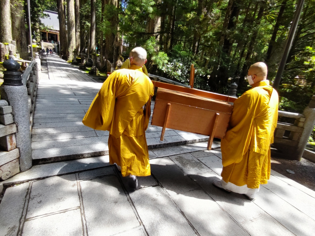 高野山を開山した弘法大師が肉身をこの世にとどめ、今も救いの手を差し伸べていらっしゃるという信仰の続く弘法大師御廟。そのためお大師さまに二度のお食事をお供えする「生身供」がおよそ1200年もの間、毎日続けられています。一の橋から御廟までの約2キロメートルの道のりには、およそ20万基を超える諸大名の墓石や、供養塔、慰霊碑の数々が杉木立の中に立ち並んでいます。「日本の総菩提所」とも呼ばれています。