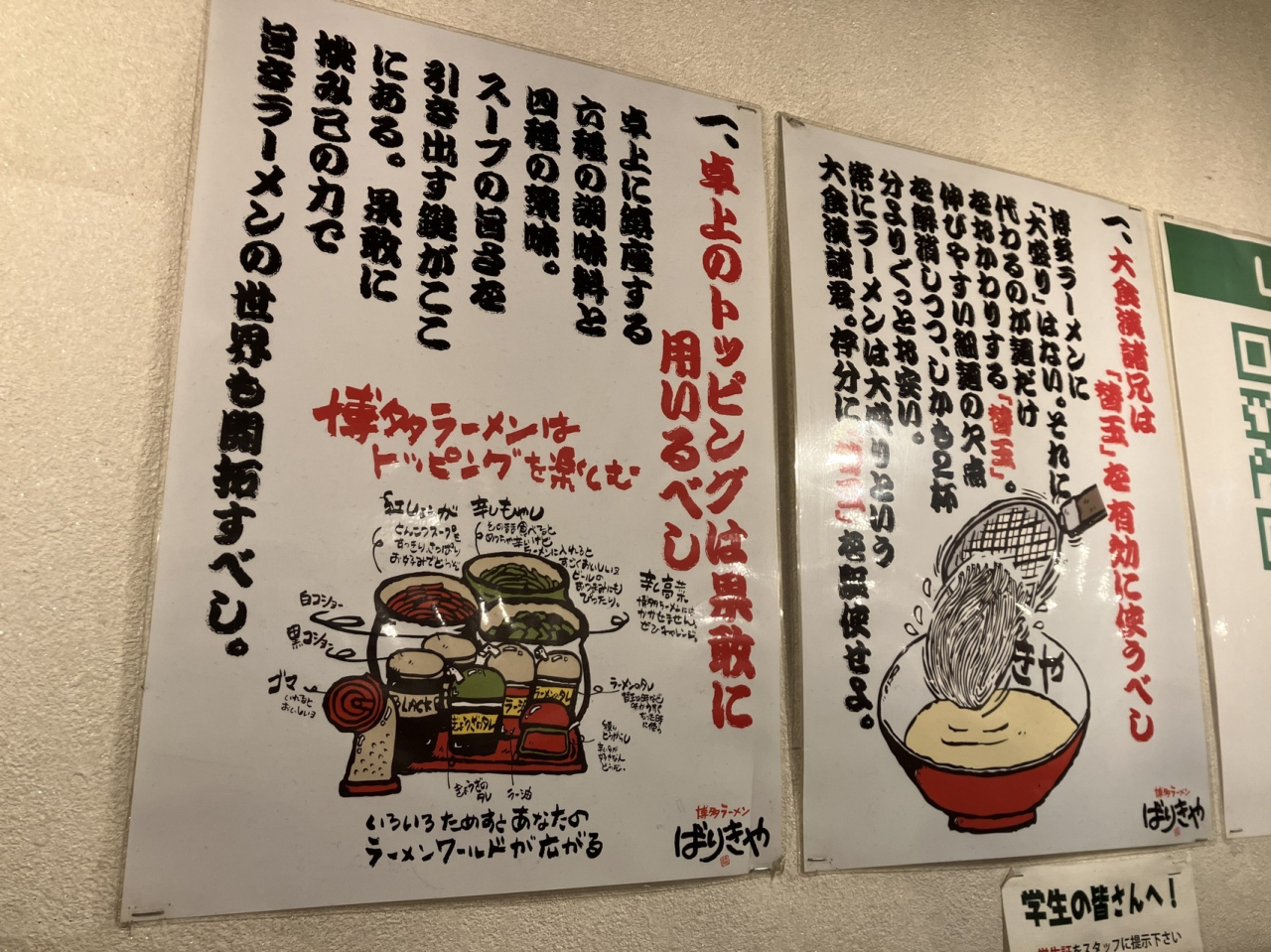 先に店内で食券を購入します。ぐるりとコの字型にカウンター席のみがあり、混雑時はグループは離ればなれで着席することになる可能性があります。ティシュは各席の右側にぶら下がっています。