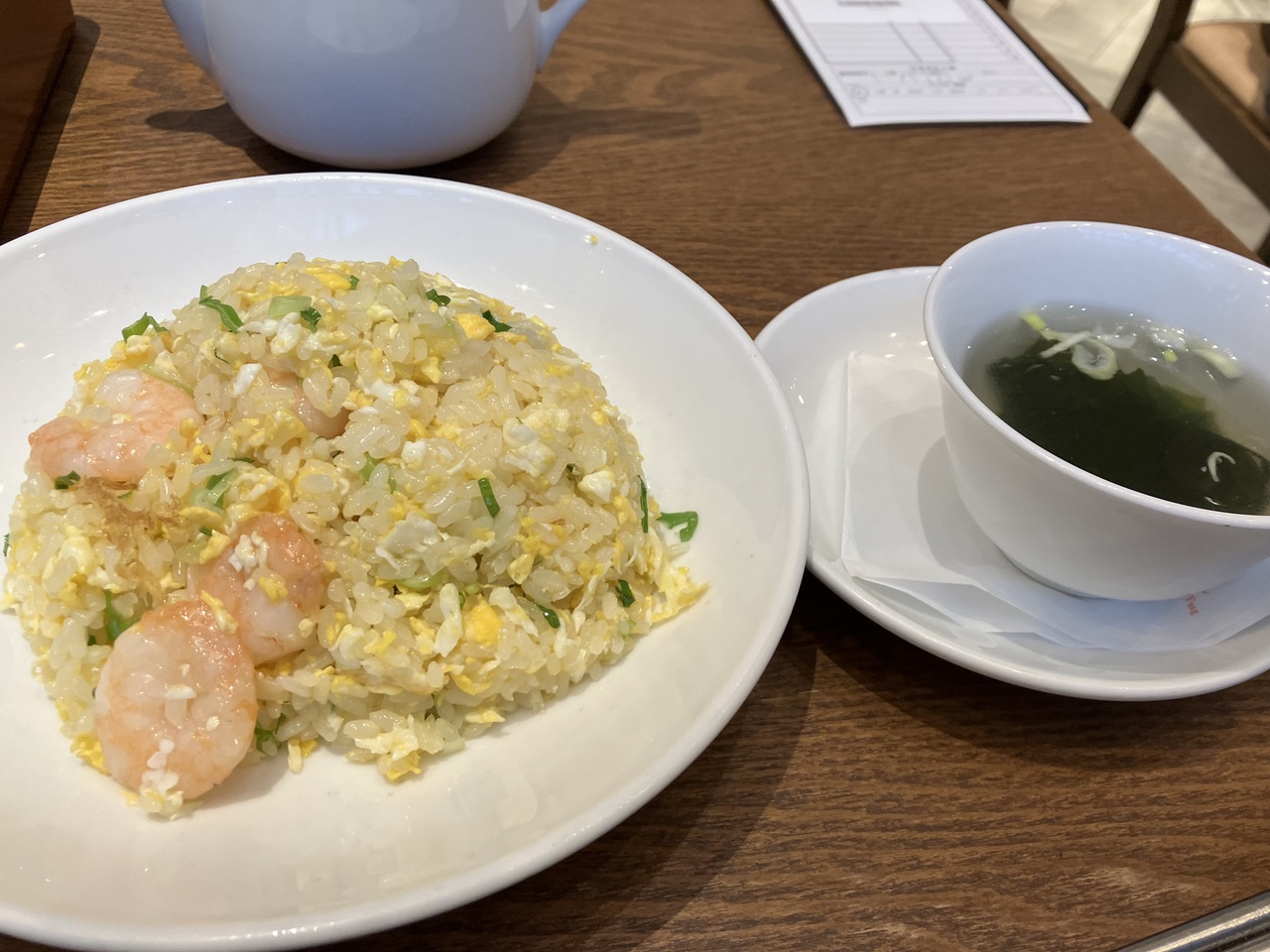 梅田阪急ビル12階のレストランフロアにお店があります。エビチャーハンと小籠包のランチセットを注文しました。お代は二千円弱でした。