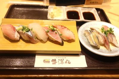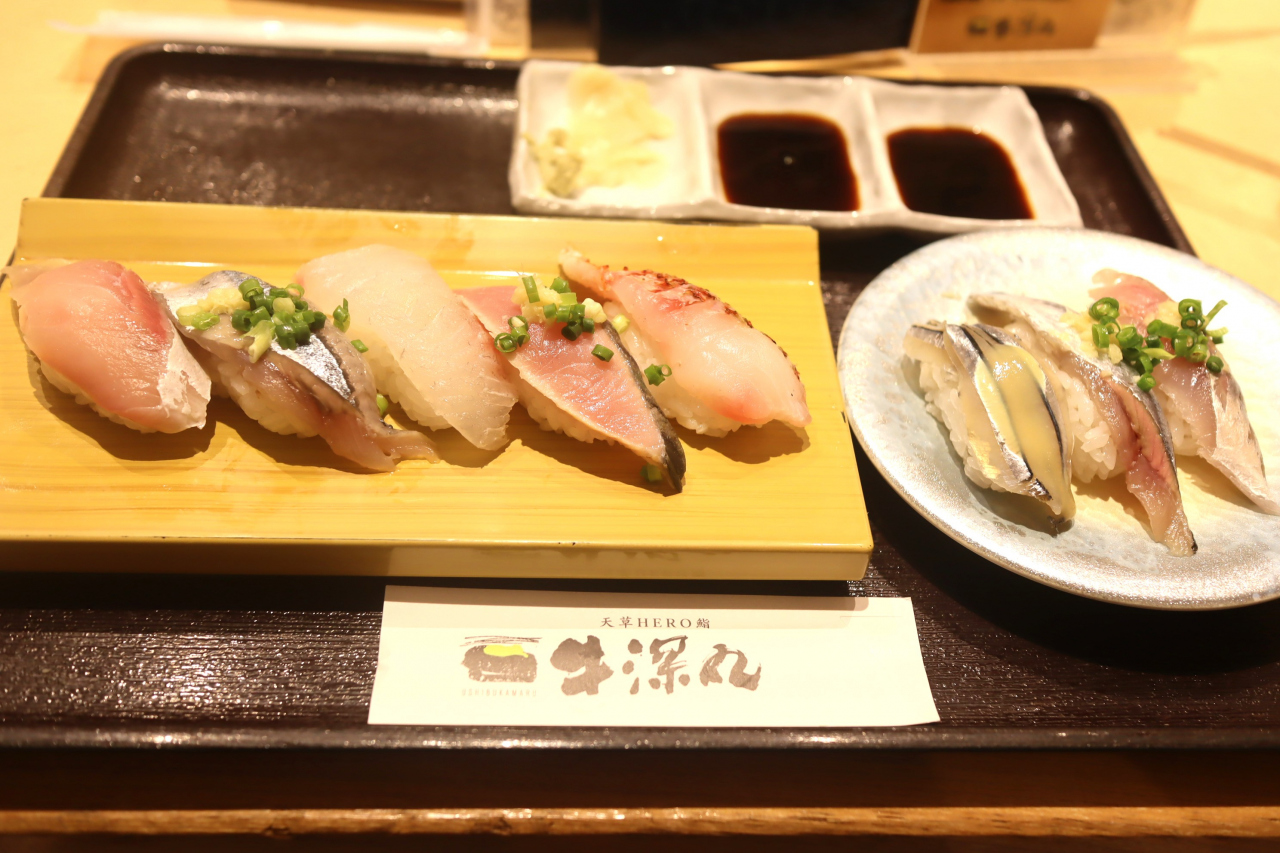 熊本の桜町バスセンタービル3階にあります。まさに屋号のとおり天草牛深の新鮮な魚介をお安く食べることができる回転寿司。店頭で紙に名前と人数を書いて待ちますが、意外と早く席を案内してくださいました。この日は、牛深丸5貫盛りや光物三昧などをいただきました。