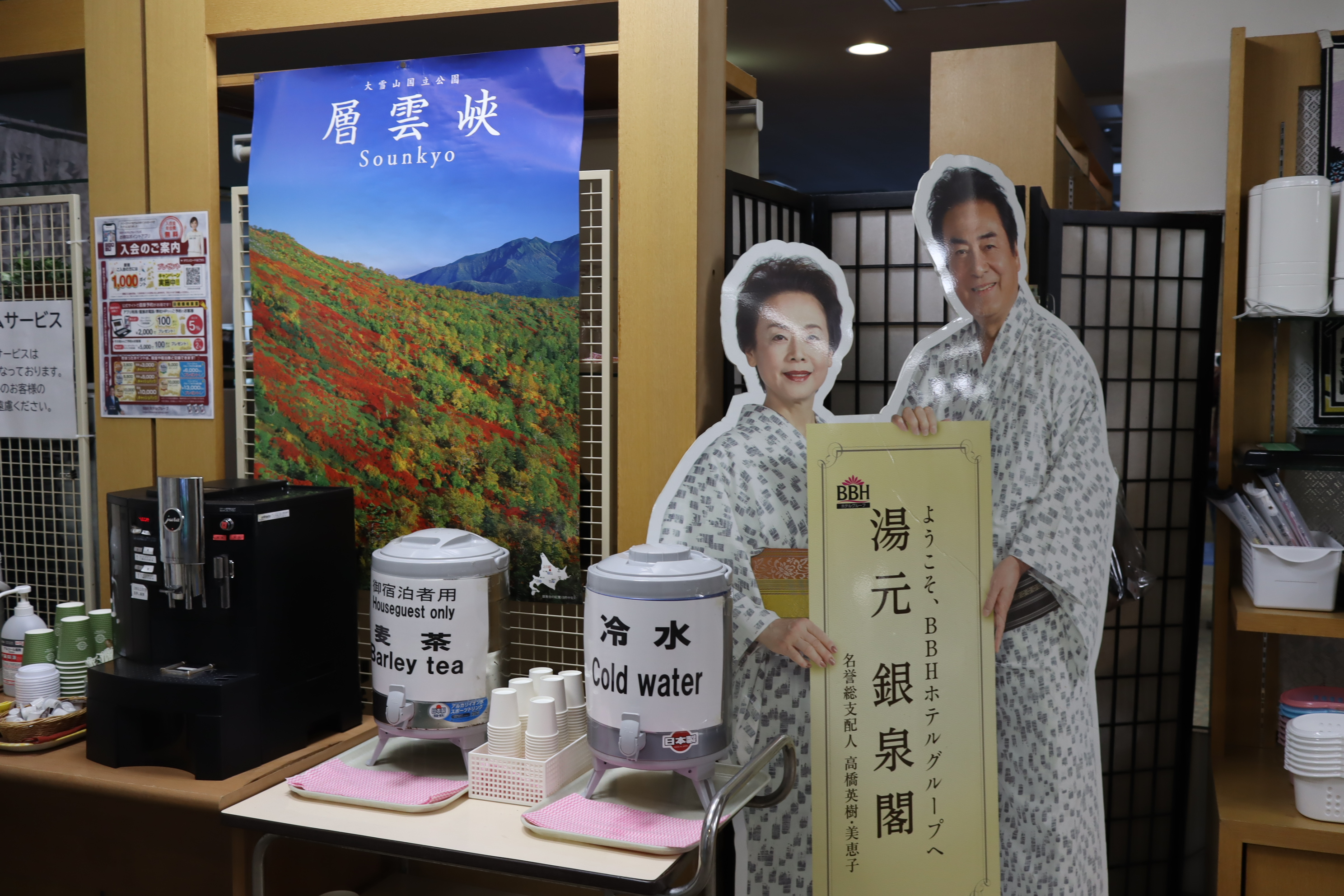 大雪山国立公園の層雲峡温泉。日本で一番早い10月初旬の紅葉を見に訪れました。黒岳ロープウェイ乗り場まで2分と好立地の「湯元 銀泉閣」。BBHグループホテルで俳優の高橋英樹さん夫婦・親子の写真パネルがありました。