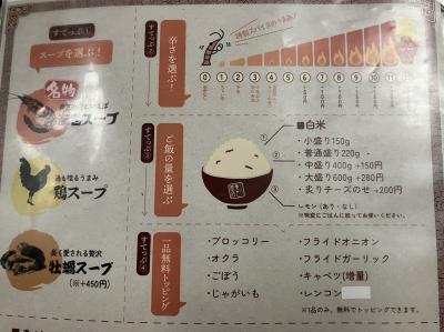 スープカレーは1600円くらいから4400円くらいまで種類がありましたが、2180円のえび大まつりを注文しました。一番人気はハンバーグのようです。いずれも、辛さ、ごはん量、トッピングを一つ選択します。- 旅行時期