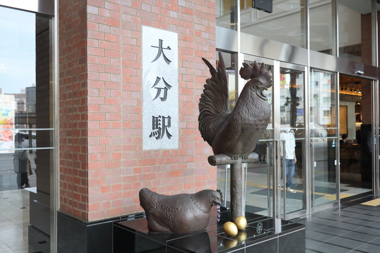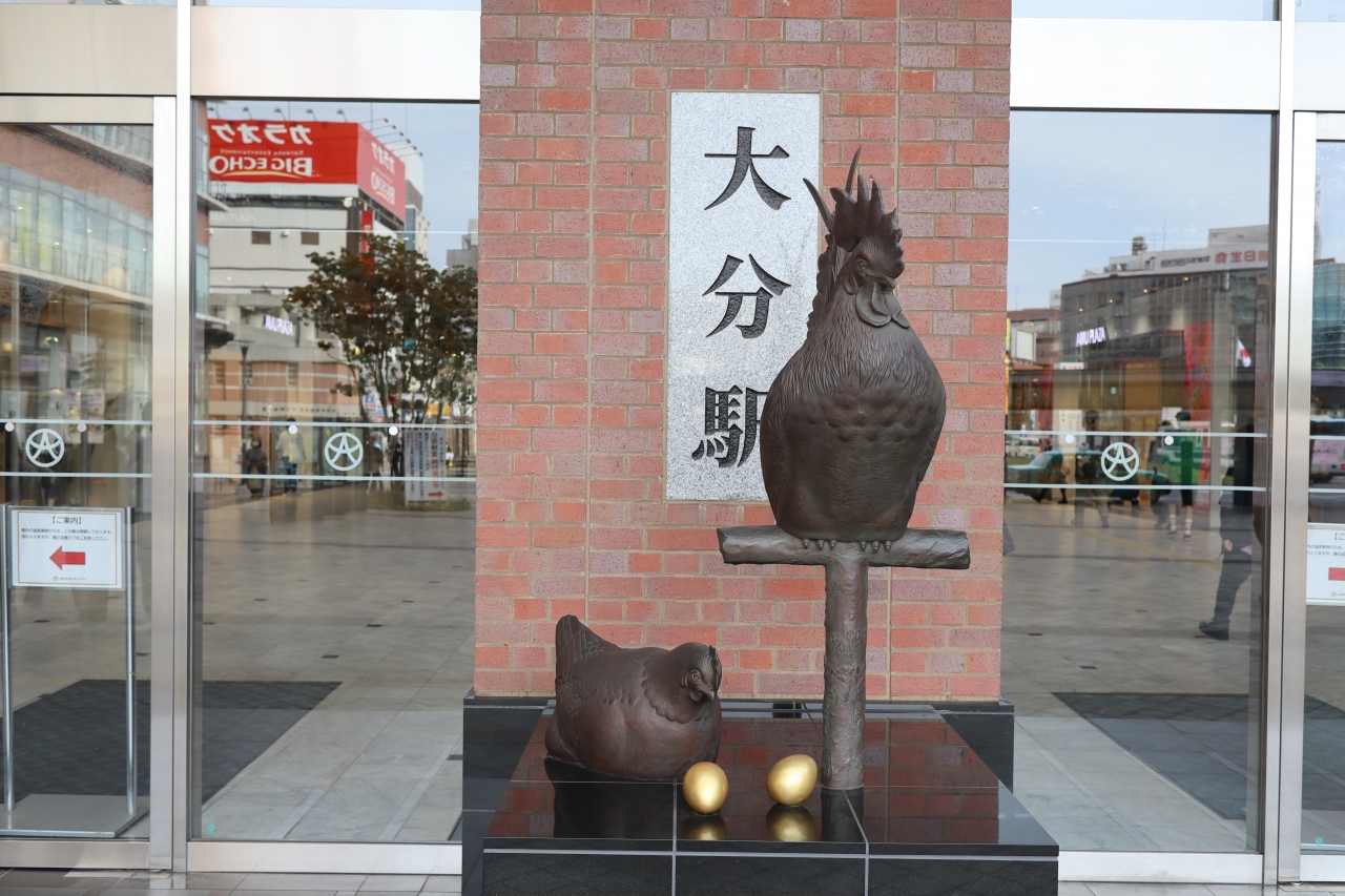 駅のメインゲート入口にはニワトリと二個の金の卵(略して「キンマゴ」)の銅像があります。大分名物の「とり天」や「唐揚げ」を連想させるものとなっています。- 旅行時期