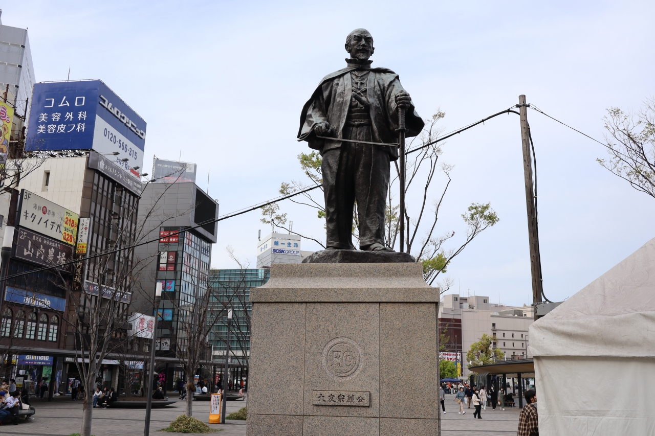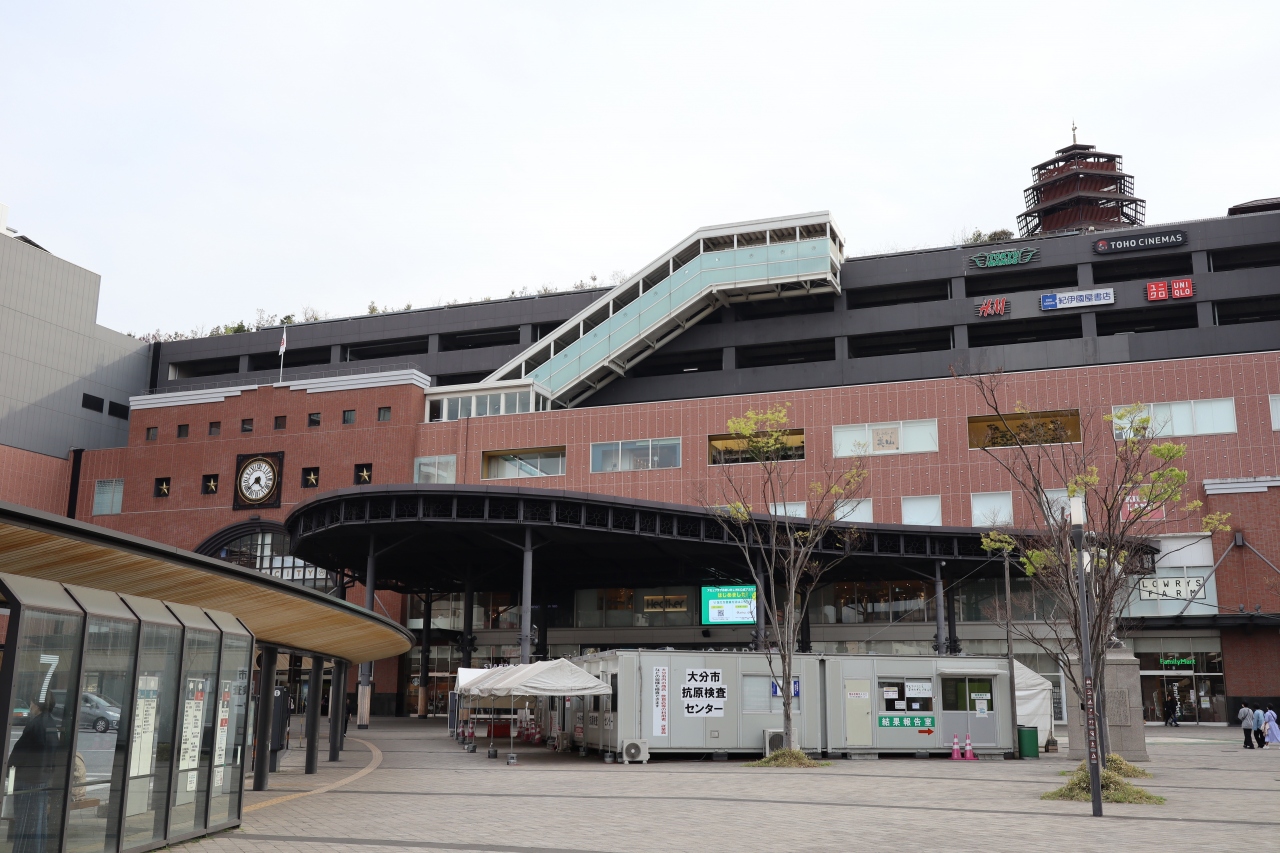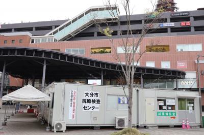 大分空港からの大分交通リムジンバスも必ずまず大分駅を経由してその後ダイワロイネットホテル前を通り終点の新川まで参ります。大友宗麟像がそびえ立つ駅前広場では多彩なイベントが行われますが、2023年4月になってもなおコロナ抗原検査センターがありました。