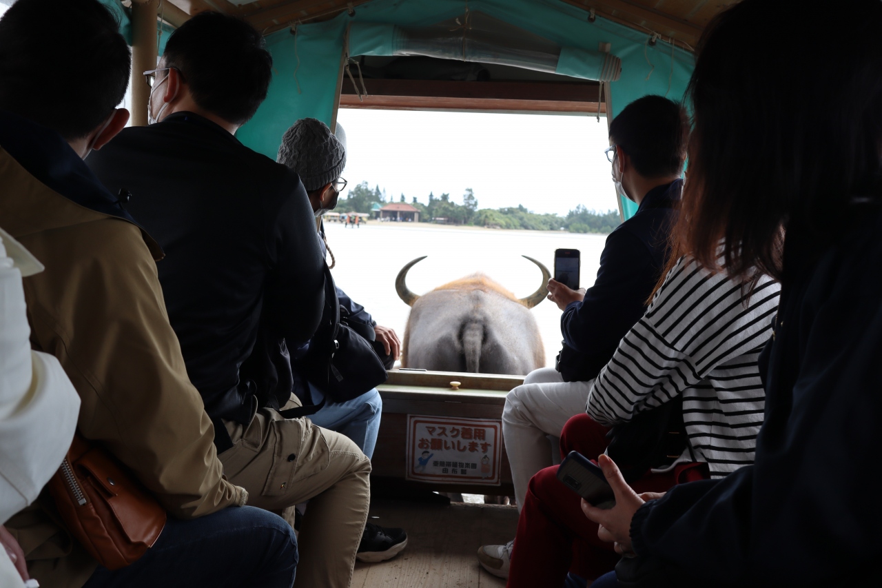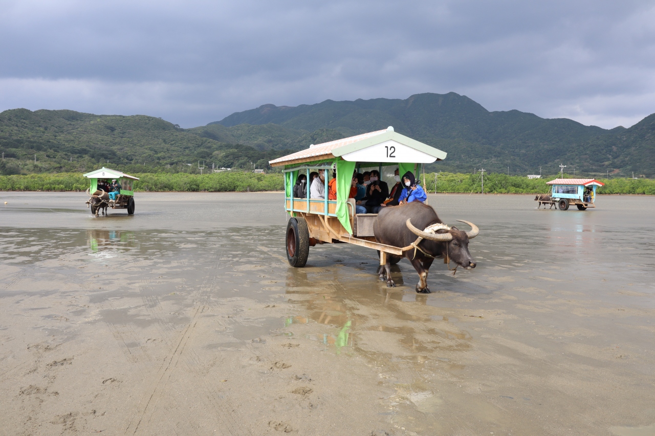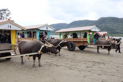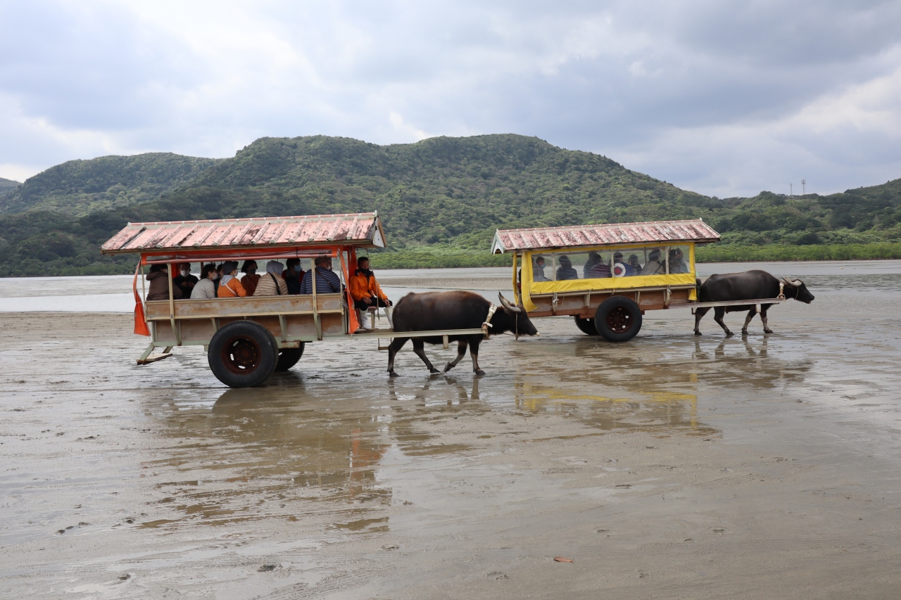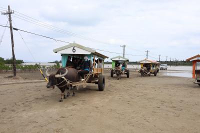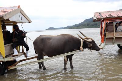 西表島から由布島への渡し舟ならぬ渡し水牛車。フィリピンの乗り物ジープニーのように向い合わせに座って膝を突き合わせて乗り合います。一度に10人ほど乗せて水牛が曳いていきます。途中、じっと立ち止まって用を足す場面もあります。仕方なく乗客もじっと待ちます。