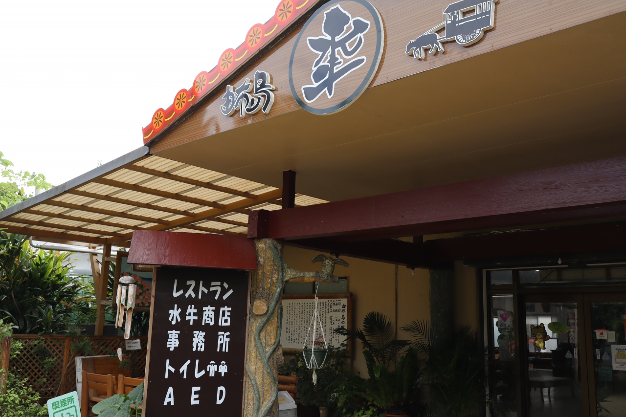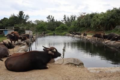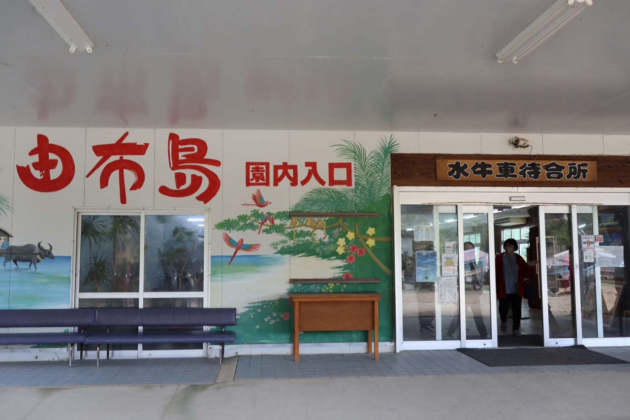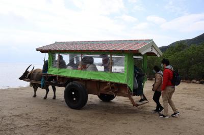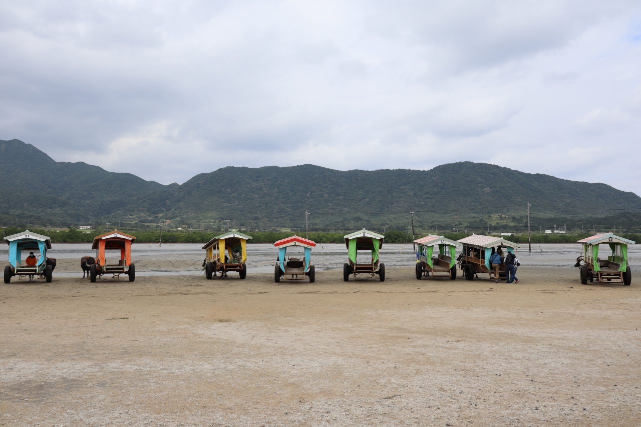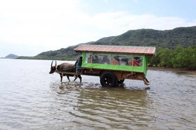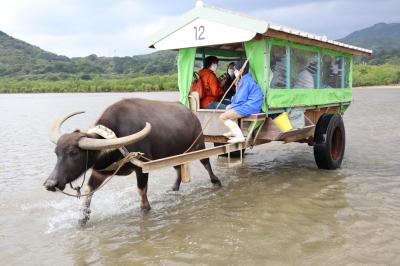 西表島から由布島への渡し舟ならぬ渡し水牛車。フィリピンの乗り物ジープニーのように向い合わせに座って膝を突き合わせて乗り合います。一度に10人ほど乗せて水牛が曳いていきます。途中、じっと立ち止まって用を足す場面もあります。仕方なく乗客もじっと待ちます。