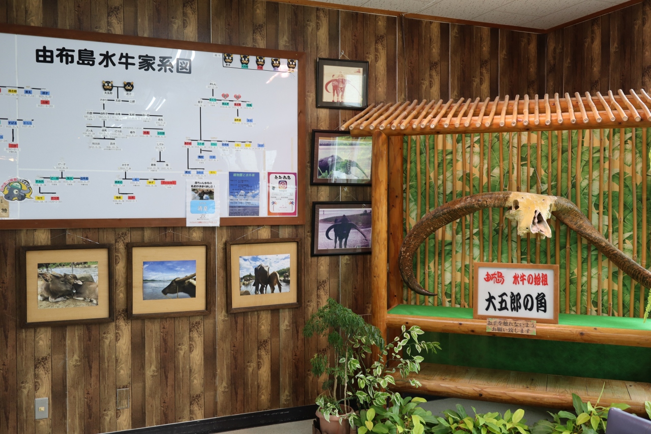 西表島美原の沖合500メートルのところにある由布島まで水牛車で海を10分程かけてゆっくり渡ります。園の入口待合所には水牛家系図が貼られていて大五郎と花子が始祖とのこと。
