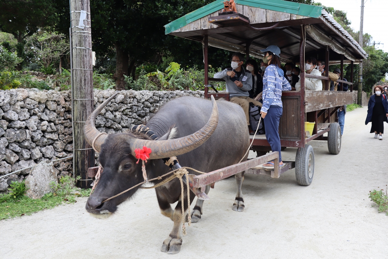 かれこれ1時間ほどの自由時間。途中、水牛車に遭遇したり、なごみの塔から赤瓦屋根の集落を見渡したり、ブーゲンビリアが咲く道を歩いて屋根シーサーを間近に見たりとのんびり散歩ができました。- 旅行時期