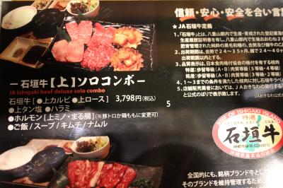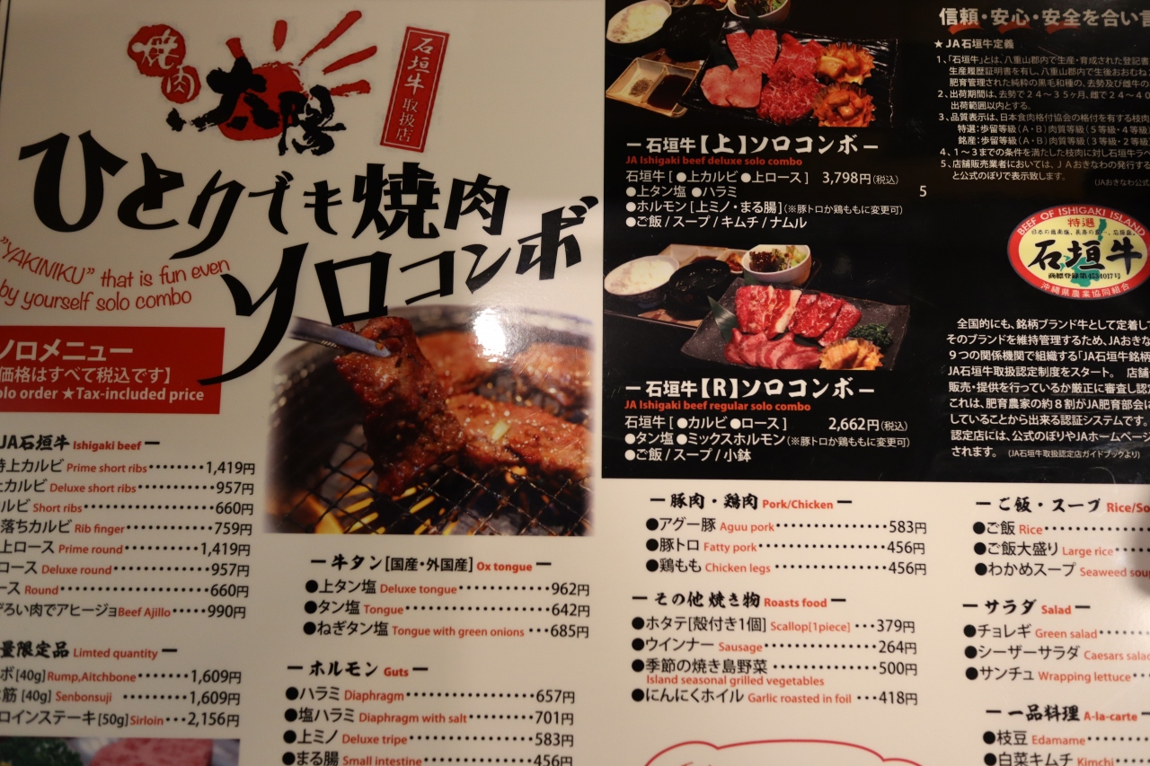 宿泊先のホテルエメラルドアイル石垣島から徒歩2分、石垣島離島ターミナルからほど近い繁華街の美崎町にある焼肉太陽は夕方16時に開店します。店内は明るくきれいで清潔です。「ひとりでも焼肉ソロコンボ」というタイトルに興味があって入店。スマホでQRコードを読み取って注文する方式ですが、あいにくスマホ操作に不慣れなことを伝えると口頭注文でOKでおいしく焼肉をいただきました。価格帯もお手頃でしたのでまたの機会に訪問したいと思いました。