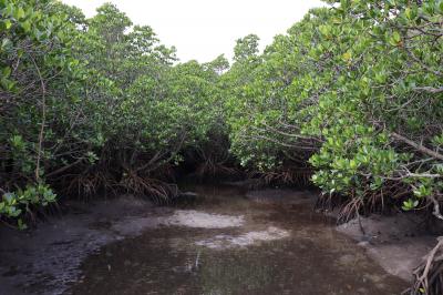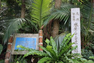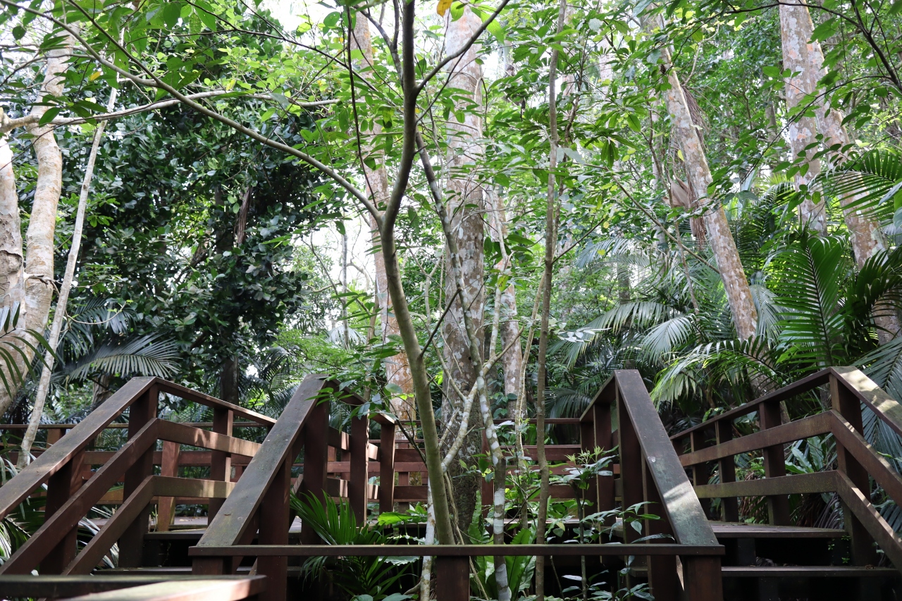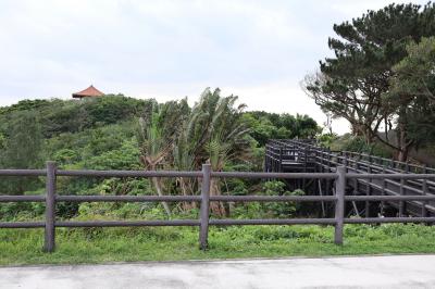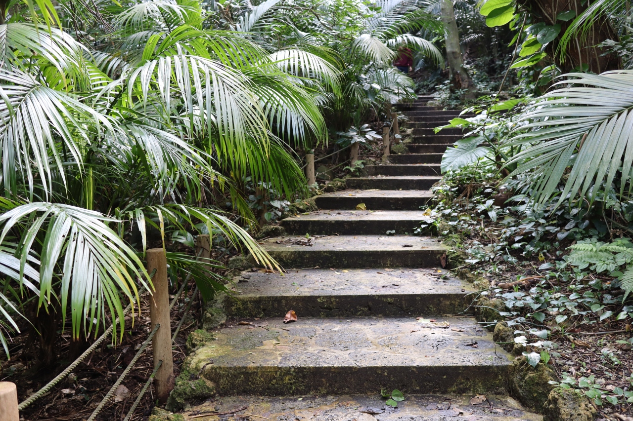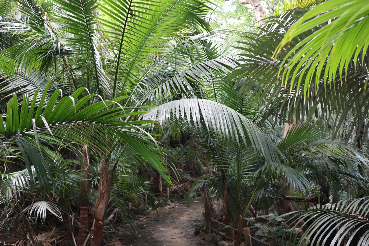 入口から遊歩道を進んで行くと左右はうっそうとしたヤシ林だらけ。遊歩道は数十メートルも行かずに小舞台のような四角い場所で突き当り折り返しになります。