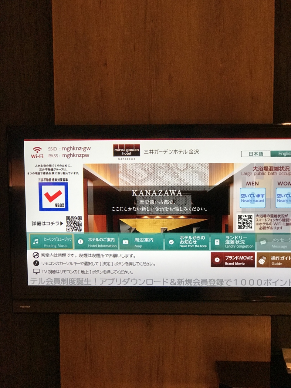 金沢の近江町市場まで徒歩5分かかりません。反対方向に歩けば片町香林坊と非常に好立地。コンビニは近くにファミマとセブンイレブンがあります。展望風呂からは金沢城公園がご覧いただけます。客室の壁には加賀百万石を彷彿とさせるカラフル文様の花柄絵画が貼られていて風情を感じ中々良いと思いました。