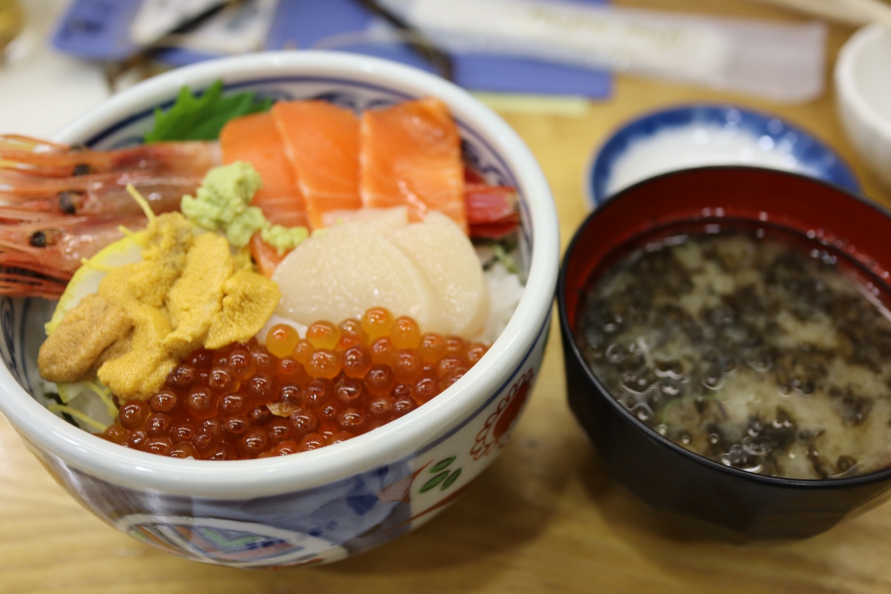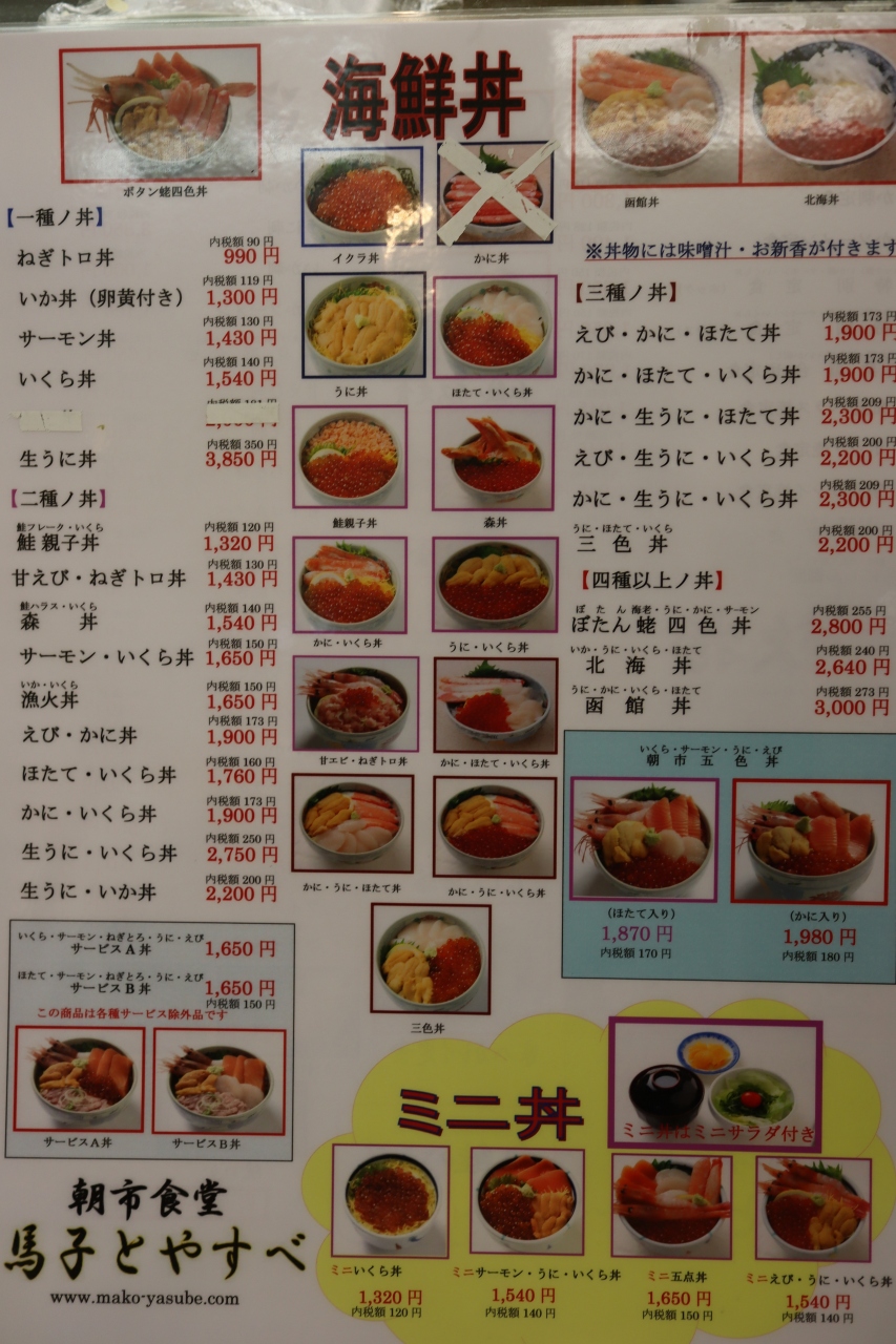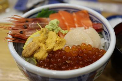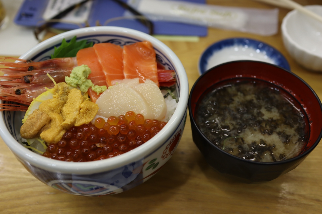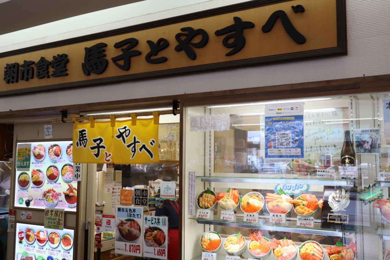 どんぶり横丁市場は函館駅前の函館朝市に面していて便利です。朝便フライトで到着後リムジンバスで函館駅に降り立つと午前10時頃、まずはそのまま朝食(兼)昼食に向かいます。海鮮丼のお店がズラリと並ぶ中で「馬子とやすべ」はどんぶり横丁市場のほぼ中央に位置します。店頭にイカ水槽があって活イカは二千円ちょっとで捌いていただけます。複数人での訪問だと注文したくなります。この日はホタテ入り五色丼を注文しました。