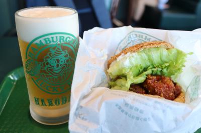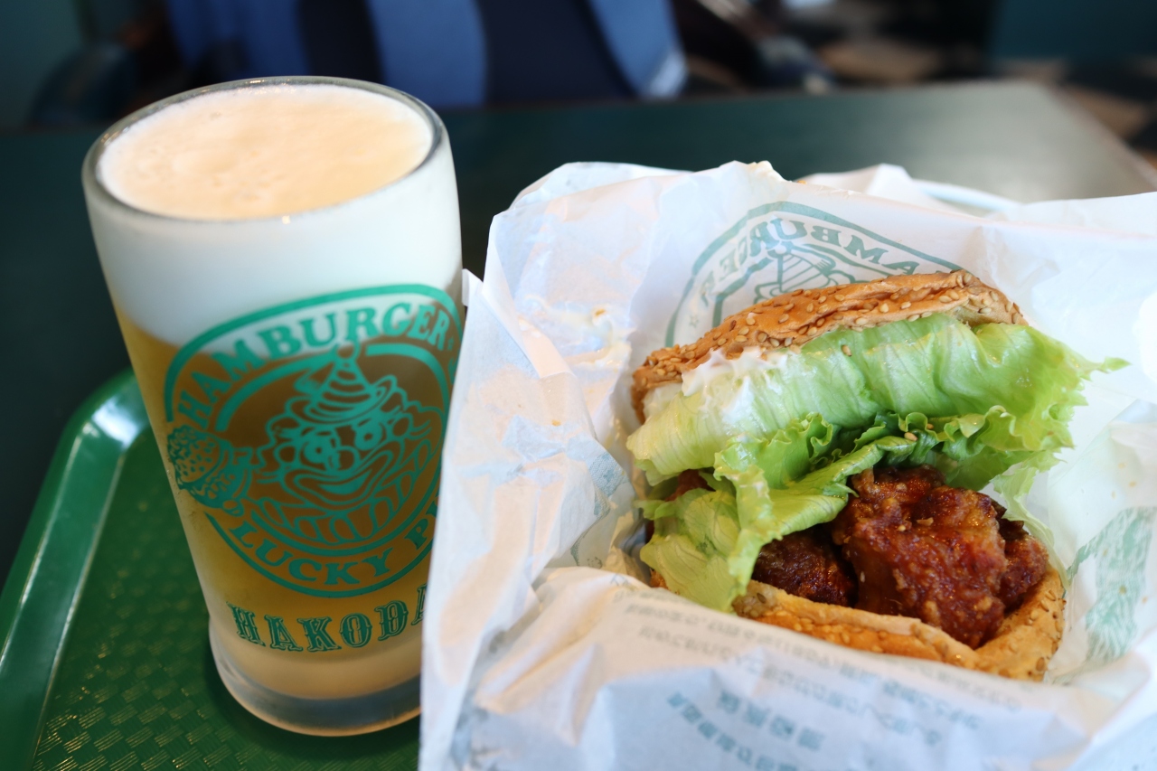 一番人気のチャイニーズチキンバーガーと生ビール(中)のセットで790円(税別)でした。チャイニーズチキンバーガーはチキンのから揚げが3つはさまれていてレタスがたっぷり入っていてとても美味しいです。但し、非常に食べにくいのでボトンと落としたり口や服を汚したりしないよう注意が必要です。場所は金森赤レンガ倉庫の向かいになります。- 旅行時期