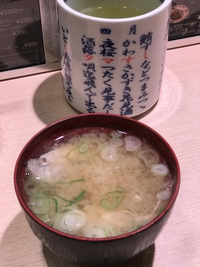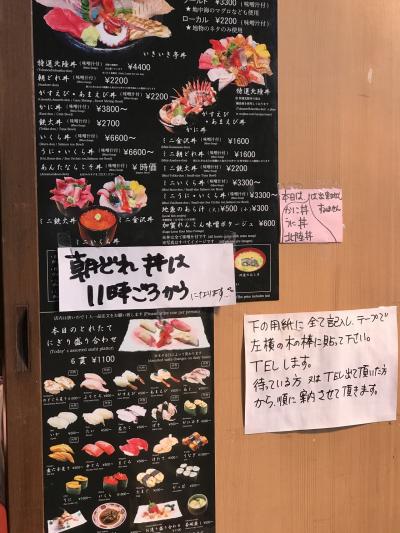 店頭に備え付けられた紙に時刻と名前と注文の品を書いて窓ガラスにテープで貼り付けます。順番に呼ばれたら入店します。この日はミニ金沢丼を注文。皿に並べられた海鮮丼のネタはご飯の上に二段構造。あら汁が付きます。- 旅行時期