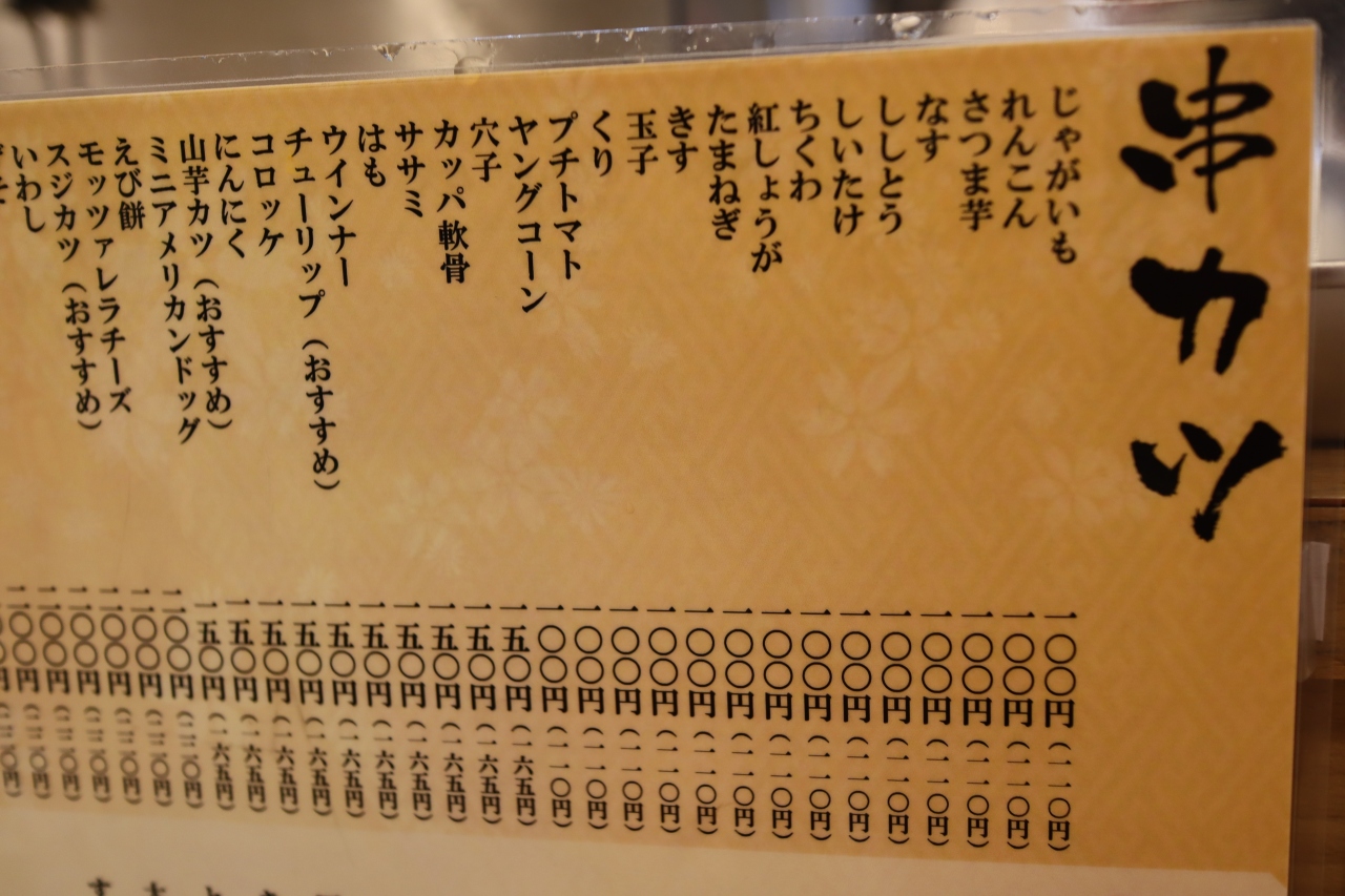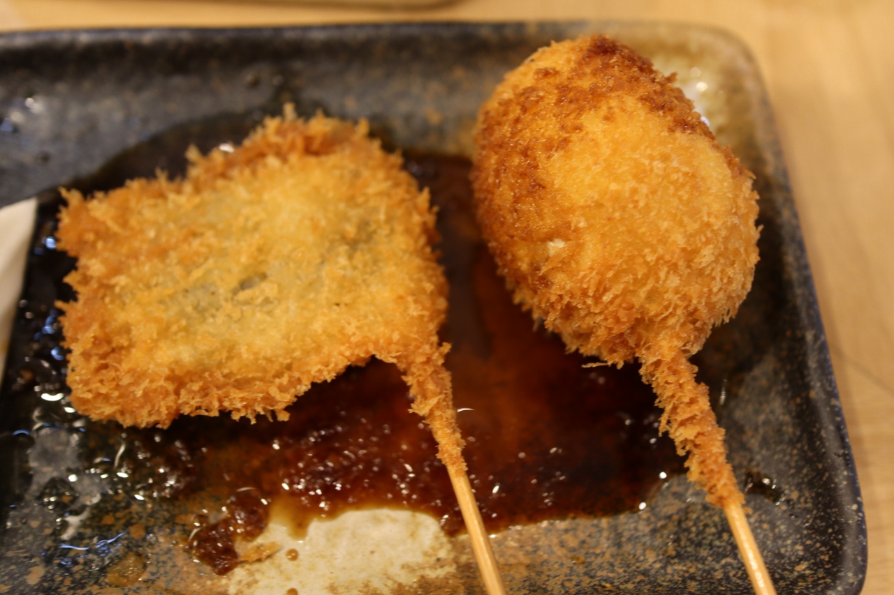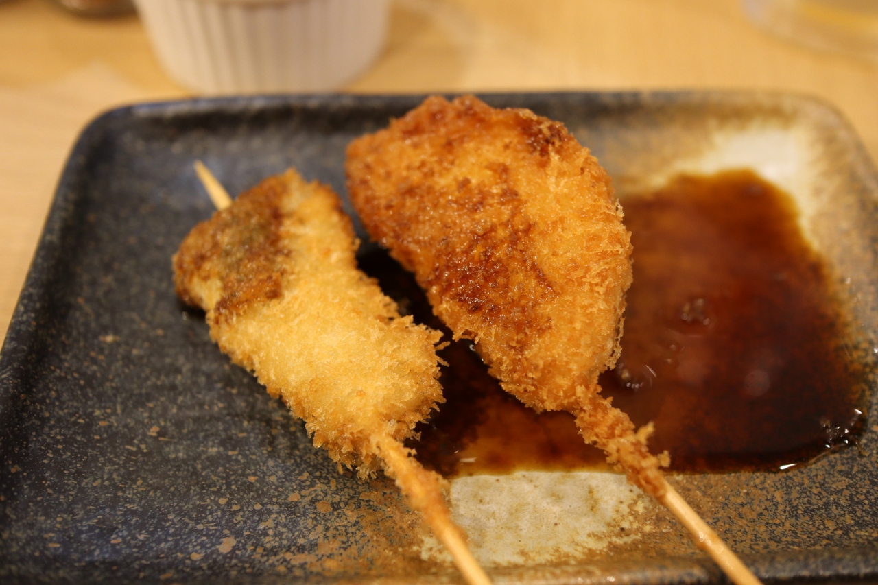 天神橋筋商店街の四丁目と三丁目の境目で地下鉄堺筋線扇町駅の近くです。串カツの七福神は別にJR天満駅の近くや天神橋筋五丁目あたりにも店舗がありますがここは混雑さを感じません。店内は明るくカウンター席のみですが隣とは仕切り板があって感染予防もバッチリで加えて明朗会計です。入店しやすいのか女性のお一人様も見かけました。串カツをお願いするとそれから衣を付けて揚げてくれます。カウンターがいっぱいの時は外の席もあるようです。